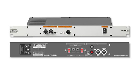 Grazie alla loro compatta dimensione (1 unità rack 19"), questi amplificatori possono trovare spazio anche in piccoli rack. La protezione contro i surriscaldamenti garantisce uno standard professionale, così come il delay alla pressione del pulsante ON per proteggere i vostri monitor contro il dannoso rumore di accensione. Il rumore non fa parte delle caratteristiche di questo amplificatore che ha un rapporto segnale-rumore di 97 dB (30 W a 1 ohm). Il compatto SINE PA 120 offre tutte queste caratteristiche e 2 uscite da 60 W.