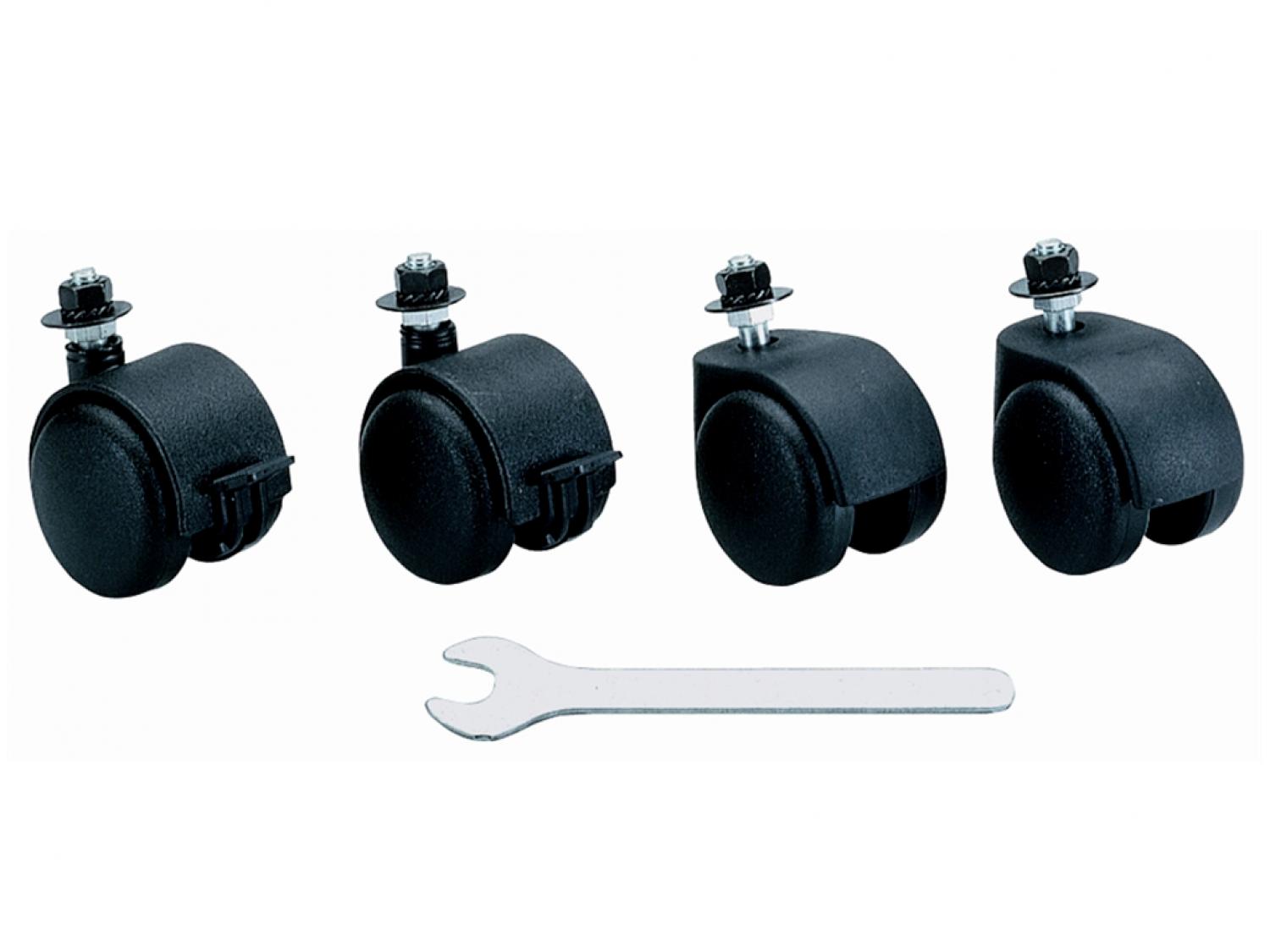 Set di ruote compatibile con tutti i supporti Quiklok a Z composto da due ruote bloccanti e due libere. L'uso delle ruote aumenta l'altezza del supporto di 6.3 cm