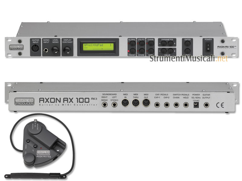 Il MIDI e la chitarra : due mondi differenti finora. Con AXON AX-100 MKII, la nuovissima versione di Axon, i problemi tecnici addetti a interfacciare una chitarra acustica o un basso al computer per farla diventare uno strumento MIDI a tutti gli effetti (per interderci come una tastiera elettronica) , sono cose del passato. Il controller inserito in una unità rack, racchiude un sistema di riconoscimento, che analizza gli impulsi transitori, generati dalle prime vibrazioni di una corda. Il sistema riconosce e calcola la dinamica e la durata della nota, prima che il suono della corda sia completamente udibile e termini il suo ciclo d'onda.