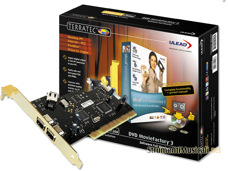 In dotazione al prodotto viene fornito in Italiano e in versione completa, l'ottimo software Ulead DVD MovieFactory 3, che permette di creare in modalità semplice e veloce i tuoi DVD o i tuoi CD con un solo click del mouse. Il pannello di controllo che contiene le operazioni necessarie per l'authoring dei dischi, offre delle procedure guidate e delle funzioni orientate all'attività specifica. La funzione Crea disco video, consente di creare nuovi filmati in modo semplice e rapido o aprire un progetto esistente per migliorare il video aggiungendo effetti di transizione, testo, audio, menu interattivi e molte altre opzioni. La funzione Modifica disco, consente di modificare i video e i menu direttamente su un disco riscrivibile DVD+R/RW, DVD-R/RW o mini-DVD utilizzando un masterizzatore compatibile. La funzione Crea disco consente di creare una nuova presentazione fotografica oppure di aprire un progetto di presentazione esistente. La funzione Direttamente su disco consente di catturare i video da qualsiasi fonte, come videocamera, VCR, TV tramite il dispositivo TerraTec e quindi masterizzarli direttamente su disco. La funzione Copia disco crea una copia da un disco o cartella DVD-Video. La funzione Stampa etichetta su disco consente di creare e stampare etichette e copertine fantastiche sui dischi. Oltre a MovieFactory 3 viene fornito il software Ulead Video Studio 7 SE che offre un'ampia gamma di funzioni di editing, di opzioni di registrazione, di output e un'estesa gamma di effetti, di transizioni e filtri per tocchi di rifinitura professionali al vostro lavoro di editing.
