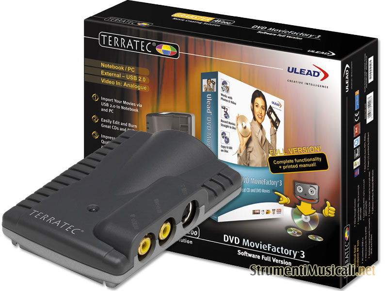 Se siete degli appassionati di videomontaggio o state per avvicinarvi a questo mondo, Grabster AV 200 è l'approccio perfetto, semplice e intuitivo per gestire al meglio ogni fase della gestione dei video digitali. Questo convertitore video esterno si connette al computer via interfaccia USB 2.0, e accetta in ingresso i formati video composito e S-Video, permettendo di collegare in un attimo il videoregistratore VHS, il decoder satellitare, la TV o la videocamera analogica al PC. Il dispositivo trasferisce i dati video da analogico a digitale in modalità RAW " senza compressione ". Modalità che permette via software di acquisire, comprimere e archiviare in qualsiasi formato oggi disponibile "DV-AVI-VCD-SVCD-DVD con la massima risoluzione video di 720x576 pixel/25fps. Il dispositivo oltre all'interfaccia standard USB che permette un'installazione semplice a livello hardware, usa i driver WDM, permettendo a livello software un'installazione senza problemi, con la massima compatibilità con Windows e con tutti i principali software di editing video. In dotazione al prodotto viene fornito in Italiano e in versione completa, l'ottimo software Ulead DVD MovieFactory 3, che permette di creare in modalità semplice e veloce i tuoi DVD o i tuoi CD con un solo click del mouse. Il pannello di controllo che contiene le operazioni necessarie per l'authoring dei dischi, offre delle procedure guidate e delle funzioni orientate all'attività specifica. La funzione Crea disco video, consente di creare nuovi filmati in modo semplice e rapido o aprire un progetto esistente per migliorare il video aggiungendo effetti di transizione, testo, audio, menu interattivi e molte altre opzioni.La funzione Modifica disco, consente di modificare i video e i menu direttamente su un disco riscrivibile DVD+R/RW, DVD-R/RW o mini-DVD utilizzando un masterizzatore compatibile.La funzione Crea disco consente di creare una nuova presentazione fotografica oppure di aprire un progetto di presentazione esistente.La funzione Direttamente su disco consente di catturare i video da qualsiasi fonte, come videocamera, VCR, TV tramite il dispositivo TerraTec e quindi masterizzarli direttamente su disco.La funzione Copia disco crea una copia da un disco o cartella DVD-Video. La funzione Stampa etichetta su disco consente di creare e stampare etichette e copertine fantastiche sui dischi. Oltre a MovieFactory 3 viene fornito il software Ulead Video Studio 7 SE che offre un'ampia gamma di funzioni di editing, di opzioni di registrazione, di output e un'estesa gamma di effetti, di transizioni e filtri per tocchi di rifinitura professionali al vostro lavoro di editing.La confezione include tutto quello che occorre per lavorare immediatamente nel video editing, dalla cattura alla produzione : il software, il dispositivo, i manuali stampati della guida utente sia del software e del dispositivo e tutti i cavi necessari per permettervi di collegare tutte le fonti video analogiche. Non occorre acquistare altro, bastono pochi istanti, tanta creatività e i vostri filmini saranno archiviati in un attimo.