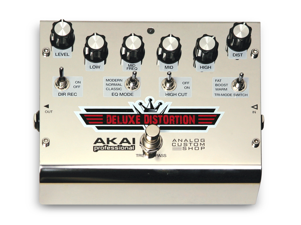 Punta di diamante della serie di pedali per chitarra Custom Shop by AKAI Professional, il Deluxe Distortion combina distorsore, controlli di tono ed emulazioni di amplificatori in un solido chassis metallico cromato e anti-ossidazione. Completo di sistema True-bypass e ben dieci controlli tra switch e potenziometri, ti darà un suono potente, realistico, senza disturbi. Lo switch a tre posizioni Eq mode fornisce un controllo di tono dettagliato con una scelta fra tre modalità: Modern, Normal e Classic. Modern, in particolare, taglia le frequenze medie portando la distorsione ai livelli hard/heavy. In modalità Normal il suono va diretto alla sezione distorsione, mentre con lo switch su Classic vengono enfatizzate le frequenze medie per un suono classic rock. Molto utile lo switch Dir Rec: impostalo su "On" per attivare l'emulazione di amplificatore così da poter entrare direttamente in un mixer, scheda audio di una D.A.W., o in un banco di ripresa bypassando il tuo sistema di amplificazione. Il GAIN è ampiamente regolabile con lo switch a tre posizioni Fat, Boost e Warm: così da ottenere sia suoni Lead, che adatti a riff ritmici. Il tono può inoltre essere ritoccato utilizzando i sei potenziometri e lo switch High Cut, il quale interviene sulle frequenze alte.