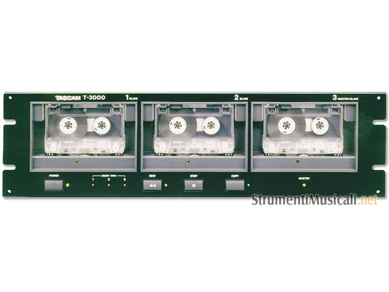 Il Duplicatore Professonale T-3000 contiene 3 meccaniche indipendenti in uno chassis a 3 unità rack. L'enfasi è tutta sulla facilità d'uso e sull'affidabilità. Le copie sono generate a velocità 4x, inserendo la cassetta originale nella piastra Master e i nastri vergini nelle due piastre rimanenti, e premendo il tasto "Copy". Entrambi i lati sono copiati simultaneamente, quindi due copie di un nastro C-60 vengono generate in solo 7.5 minuti. I duplicatori T-3000 possono essere collegati in serie (cascata) generando quindi un grande numero di copie da un solo originale. Il Tascam T-3000 è una soluzione semplice ed efficace per una struttura che necessiti di un sistema di duplicazione rapido ed economico.