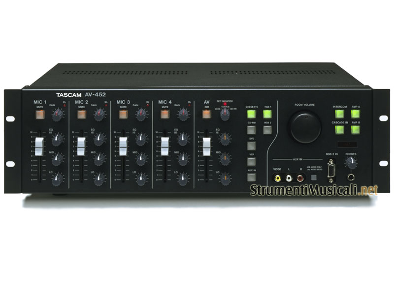 Negli ultimi anni, l'impiego di tecnologia avanzata nelle presentazioni audiovisive è aumentato esponenzialmente, in termini di qualità e di aspettative del pubblico. I tempi in cui una presentazione multimediale era ad esclusivo appannaggio di una ristretta elite sono lontani. Oggi, una presentazione in PowerPoint, arricchita da contenuti multimediali è lo standard in qualsiasi ufficio, scuola o conferenza. Il nuovo TASCAM AV-452 è progettato esattamente per questa nuova generazione di relatori. L'AV-452 è una combinazione tra un mixer audio, un selettore di segnali A/V e un amplificatore di potenza. Il pannello frontale è semplice ed intuitivo come un tipico amplificatore Home Theather domestico. Ma pur con un'interfaccia così semplice, è dotato di una rilevante potenza in termini di integrazione e di flessibilità di utilizzo. Ad esempio, l'AV-452 può acquisire ed apprendere i comandi infrarossi per un proiettore o una TV. Quando una sorgente A/V è selezionata sull'AV-452, il codice IR per quella sorgente può essere inviato alla TV o al proiettore, assicurandone la corretta gestione. Inoltre, in dotazione c'è un telecomando universale programmabile, per centralizzare il controllo dall'AV-452 e di altri quattro componenti. Per gli installatori, l'AV-452 offre numerose opzioni di controllo e customizzazione. L'AV-452 può anche integrarsi con sistemi di allarme e accettare segnali a voltaggio costante. Inoltre, ci sono due alternative per il controllo di apparecchi esterni: LED e pulsanti possono essere collegati alla porta Relay Control dell'AV-452. Oppure si può utilizzare la porta seriale per collegarsi a un sistema di controllo tramite i protocolli RS-232, RS422 e RS-485. L'AV-542 è predisposto per inserirsi in una grande varietà di installazioni e può essere facilmente espanso. L'ingresso "cascade" può accettare le uscite di un altro AV-452 o di un altro mixer, per aggiungere canali disponibili. Oppure, un amplificatore finale potrebbe utilizzare questa porta per raggiungere altre stanze o zone separate con livelli indipendenti di amplificazione.