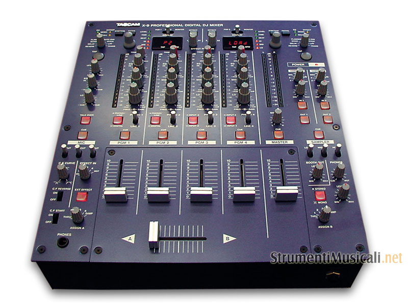 Il mixer TASCAM X-9 è uno strumento versatile e professionale, che combina un mixer a 4 canali, con due processori multieffetto e due campionatori. Il risultato è un mixer di eccellente qualità, che permette di esprimere la massima creatività sera dopo sera. Progettato per i DJ più innovativi, la superficie di controllo dell'X-9 è concepita per combinare prestazioni estreme con una eccellente facilità di utilizzo. Grazie ad una moltitudine di ingressi, analogici e digitali, si può collegare e mixare praticamente qualsiasi sorgente il Dj possa immaginare, da giradischi a CD-Players, a effetti esterni ed altro ancora. Per offrire il meglio nella performance, l'X-9 offre due processori multieffetti integrati e programmabili. Si può processare il segnale con efffetti come distorsione, riverbero, delay, eco, flanger, autopan, low-fi, cambiare l'intonazione, applicare un filtro passa-basso, ed altro ancora, e memorizzare 30 impostazioni preferite. Inoltre l'X-9 è dotato di EQ parametrico, per un controllo assoluto sulla tinbrica del segnale. Tutte le impostazioni di EQ sono memorizzabili e richiamabili. Tramite il campionatore, si può acquisire un campione da ogni canale, dall'uscita master, dall'ingresso microfonico o da ciascun lato del crossfader. La funzione fader start può essere assegnata a diversi controlli fisici del mixer, permettendo una flessibilità senza precedenti per un mixer da DJ. Sia che si combini l'X-9 con i lettori CD TASCAM CD-X1700/1500 o con qualsiasi altra apparecchiatura, l'X-9 rappresenta un formidabile passo avanti nella tecnologia applicata alla musica dance.