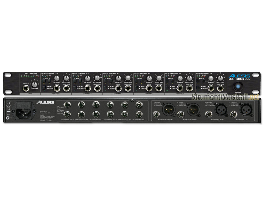 Il MultiMix 6 Cue è un mixer e amplificatore per cuffie equipaggiato di 6 potenti ampli, dall'ottima qualità sonora anche quando si opera a bassi volumi di ascolto. Con il MultiMix 6 Cue potrai creare sei differenti mix per controllare fino a 18 differenti cuffie, dato che ogni ampli fornisce ben 3 uscite. Ognuno dei 6 canali dispone di un led meter a 4 segmenti per la visualizzazione dei livelli. Ogni canale può operare a discrezione dell'utente in mono, oppure in modo stereo. Un ingresso Aux su connettore Jack da ¼" presente in tutti i canali consente il collegamento di una qualsiasi sorgente sonora ad ogni singolo canale. In più, un ingresso Direct In permetterà di collegare una sorgente addizionale da distribuire su tutti e 6 i canali. Nel pannello frontale del MultiMix 6 Cue troviamo per ciascun canale una connessione Jack da ¼" TRS per il collegamento delle cuffie, con i rispettivi controlli di volume e bilanciamento. La sezione main offre invece un led meter ad 8 segmenti e un livello per il volume Master. Nel pannello posteriore trovano sede 2 uscite cuffia addizionali su ciascun canale, per un totale di 18 paia di cuffie collegabili contemporaneamente all'unità. Nel pannello frontale sono inoltre collocati gli ingressi e le uscite stereo formato Jack da ¼" e XLR bilanciati. L'Alesis MultiMix 6 Cue è la soluzione ideale per il monitoraggio in cuffia multiplo in sala prove, nelle esibizioni dal vivo, o in studio di registrazione. Potrai connettere in cascata tra di loro più MultiMix 6 Cue per aumentare il numero di cuffie, o in-ear monitor collegabili, oppure potrai interporre in studio il MultiMix 6 Cue tra le uscite Master della tua scheda audio e l'impianto principale, permettendo così a tutti i musicisti che stanno registrando una sessione multi-traccia di ascoltarsi in cuffia e di regolarsi in modo indipendente il volume di ascolto.