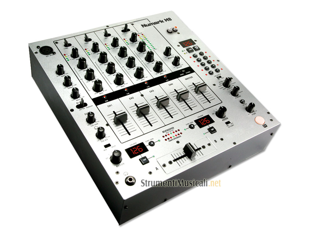 Il mixer M8 della Numark è stato progettato per assecondare le esigenze del DJ e dei club alla ricerca di un mixer completo di numerosi ingressi, effetti e dall'ottimo rapporto qualità prezzo. L'M8 è un mixer a 4 canali, che mette a disposizione ingressi per giradischi, lettori CD, microfoni e per qualsiasi sorgente esterna di tipo line. È presente anche un ingresso line stereo ausiliare su connettori RCA direttamente sulla plancia del mixer, per un rapido e comodo collegamento di eventuali lettori esterni come mp3 player e smart phone dai quali riprodurre direttamente i file musicali. Il mixer M8 offre su ogni canale un eq 3 bande, un gain, preascolto e un led meter a 4 segmenti. È inoltre presente un canale microfonico con ingresso XLR indipendente, sul quale potremo intervenire mediante un fader di volume, eq 2 bande e un potenziometro per il guadagno. Grazie alla tecnologia Beatkeeper™, che analizza automaticamente la velocità in BPM delle tracce, potremo sincronizzare gli effetti alla velocità delle canzoni in riproduzione. Sulla parte sinistra della plancia troviamo un multi-effetto integrato capace di operare in pre e post fader e dotato di numerosi effetti, molti dei quali modulabili da un LFO sincronizzato ai BPM e adattabile a varie divisioni metriche mediante una sezione di pulsanti dedicati. Tra gli effetti disponibili troviamo delay, filtri, flanger, ecc. Potrai selezionare l'effetto utilizzando un potenziometro a scatti, così come da un altro potenziometro potrai decidere a quale canale, ad uno dei lati del crossfader, oppure al Master applicare l'effetto. Il potenziometro wet/dry ti permetterà di decidere la quantità di effetto da applicare. Ottima anche la dotazione di uscite, che vede la presenza di 3 coppie di RCA (Master, cassa spia e Record) e un'uscita bilanciata Master su connettori XLR. Ovviamente non poteva mancare il crossfader con i relativi potenziometri a scatto (A e B) per l'assegnazione dei canali.