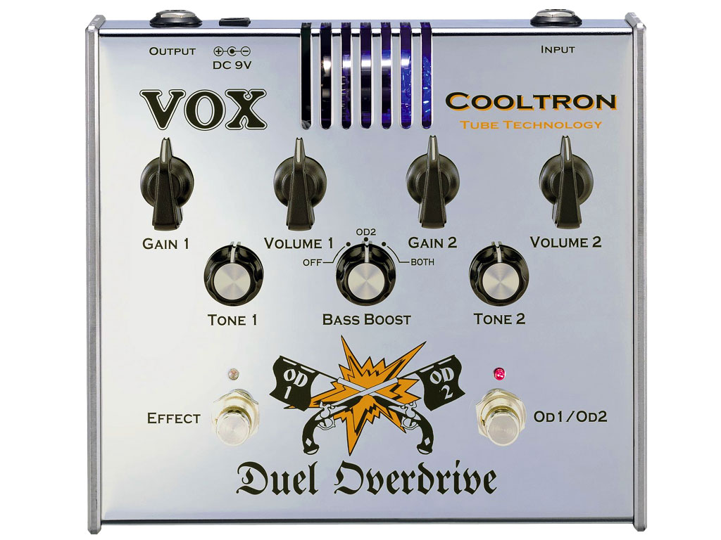 Con due circuiti di overdrive basati sul pedale Vox Big Ben Overdrive, il Dual Overdrive dà accesso a due suoni selezionabili tra una infinità di suoni classici e moderni. Con i controlli Gain, Volume e Tono separati, è possibile impostare il pedale con due suoni overdrive totalmente indipendenti, come complemento ad un suono pulito bypassato. Per renderlo ancora più flessibile, Vox ha aggiunto una funzione boost delle basse frequenze per suoni overdrive fat e ricchi di bassi.