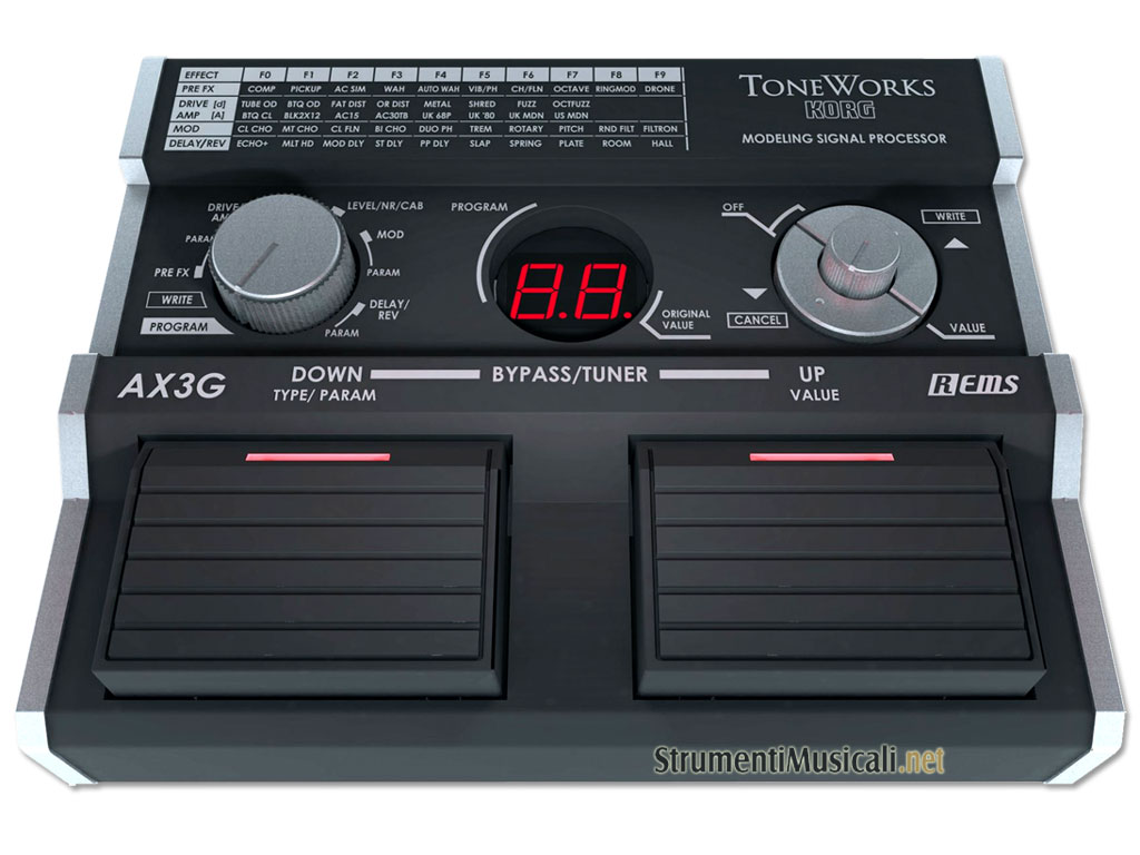 • 31 modelli di effetti di cui 10 tipi di Pedali, 10 tipi di Modulazioni, 5 tipi di Delay, 5 tipi di Riverberi + 1 x Noise Reduction