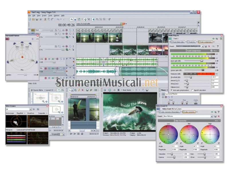 Vegas5 è un software completo e professionale, dedicato all'editing audio e video su sistema operativo Windows. E' perfetto per la produzione Audio e Video, la registrazione multi traccia, e l'editing audio e video di molti formati - dall' NTSC e Pal al RealVideo ®, Apple ®, QuickTime ® e Windows Media ®. Conosciuto per i video broadcast e per l'audio di alta qualità, Vegas 5 fornisce ed integra una soluzione ottimale per la produzione video, per l'editing, per il missaggio, per la produzione di audio surround e molto altro. Vegas5 include un set di strumenti per manipolare il suono in ogni genere di produzione, permettendo di missare l'audio in un progetto multitraccia su un numero infinito di tracce, utillizzare la "on-the-fly punch-in recording", monitorare l'ingresso in registrazione con i meter in tempo reale, modulare il suono con i 32 effetti assegnabili, utilizzare i 26 master e le uscite Aux, creare crossfades automatici e controllare manualmente le operazioni grazie ad alcuni hardware compatibili.