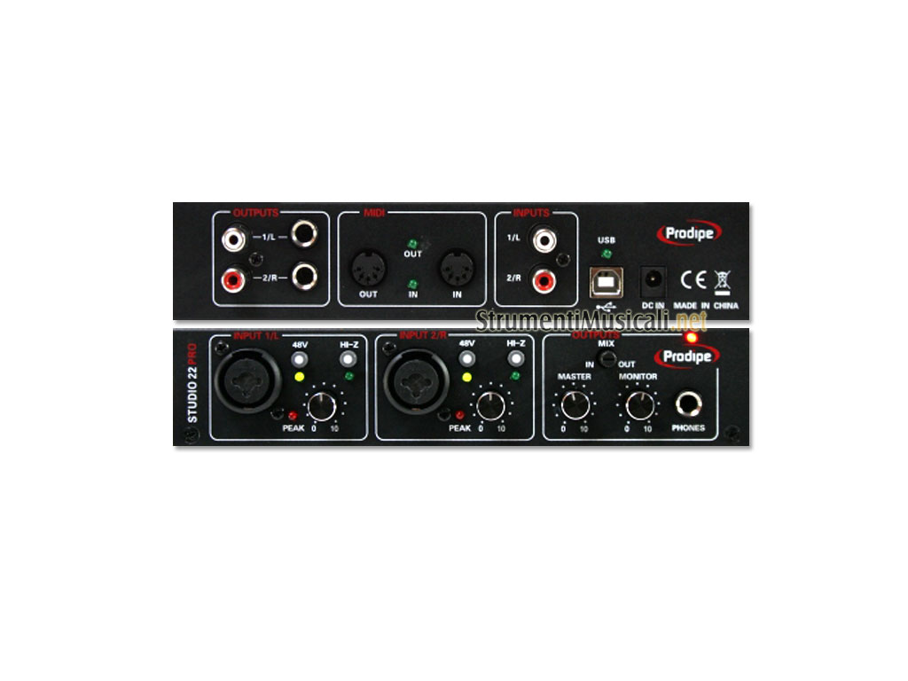 Prodipe Studio 22 Pro è una nuova interfaccia audio USB 2x2 ideale per voci e strumenti. E' dotata 2 ingressi microfonici con phantom power 48V e instrument Hi-Z, in formato combo, 2 ingressi di linea RCA, 2 uscite di linea con doppio connettore jack da 1/4" e RCA, ingresso e uscita MIDI, uscita cuffie con controllo del livello indipendente e manopola per la regolazione del monitoraggio hardware. Studio 22 Pro si alimenta direttamente dal bus USB ed è compatibile in modo nativo con computer Windows e Macintosh. Include i software Cubase LE 5, Prodipe VE e Prodipe TimeStetch.