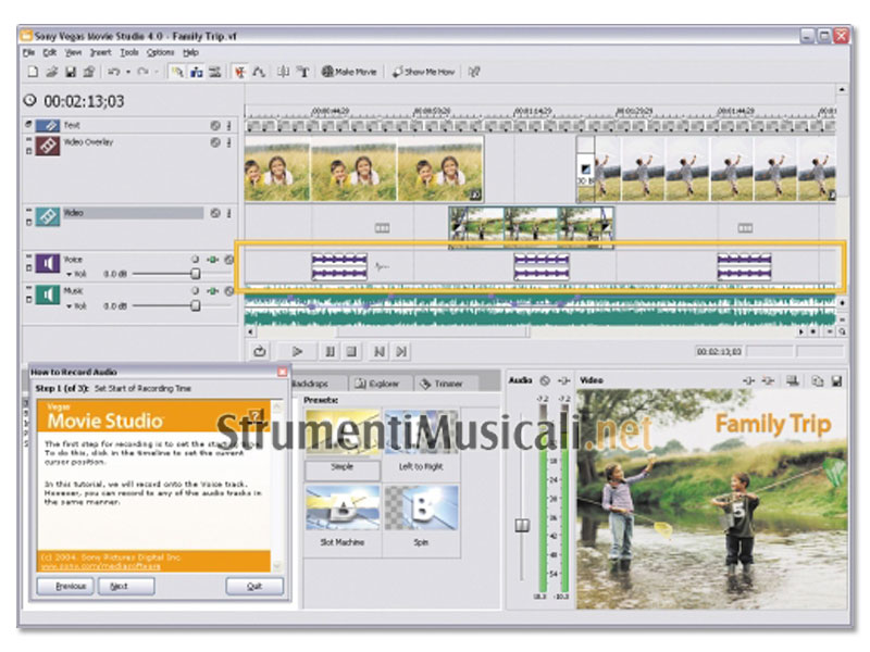 E' semplice trasferire video e foto digitali sul vostro computer. Vegas Movie Studio si occupa della gestione dei vostri media ed è in grado d'individuare con precisione dove ogni scena inizia e finisce. Vi offre editing accurati, centinaia di effetti speciali, transizioni in 3D, clip video, titolazione, sottofondi musicali, effetti sonori e molto altro ancora. Oltre 30 tutorial provvedono poi a guidarvi nei diversi processi creativi in modo che possiate subito mettere in pratica la vostra creatività senza dover perdere tempo ad imparare l'utilizzo. Utilizzate DVD Architect Studio per creare i vostri DVD, produrre filmati contenenti diversi menu, pulsanti e link. O create slideshow e compilation musicali. Condividete le vostre creazioni su DVD, Video CD, CD, salvatele sul vostro hard disk o mettetele in rete.