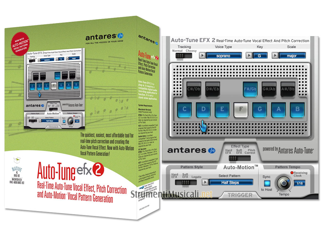 Auto-Tune EFX 2 è l'ultima generazione del tool Antares per correggere in modo semplice e rapido l'intonazione della voce. Auto-Tune EFX 2 si basa sulla stessa straordinaria tecnologia di Auto-Tune 7. La nuova funzione Auto-Motion Vocal Pattern Generation consente di aggiungere alle tracce un'ampia selezione di pattern musicali complessi per creare un effetto innovativo e sorprendente. Il nuovo effetto Auto-Motion Vocal Pattern Generation sfrutta le funzioni di pitch-shifting di Auto-Tune per aggiungere pattern musicali ad una traccia vocale: basta selezionare un pattern dalla libreria integrata ed espandibile. Poi potete impostare il BPM del pattern oppure metterlo in sync con il tempo del sequencer secondo diverse suddivisioni ritmiche. A questo punto basta cliccare sul pulsante Trigger di Auto-Tune in qualsiasi momento, per spedire la traccia di voce verso nuove avventure melodiche.
