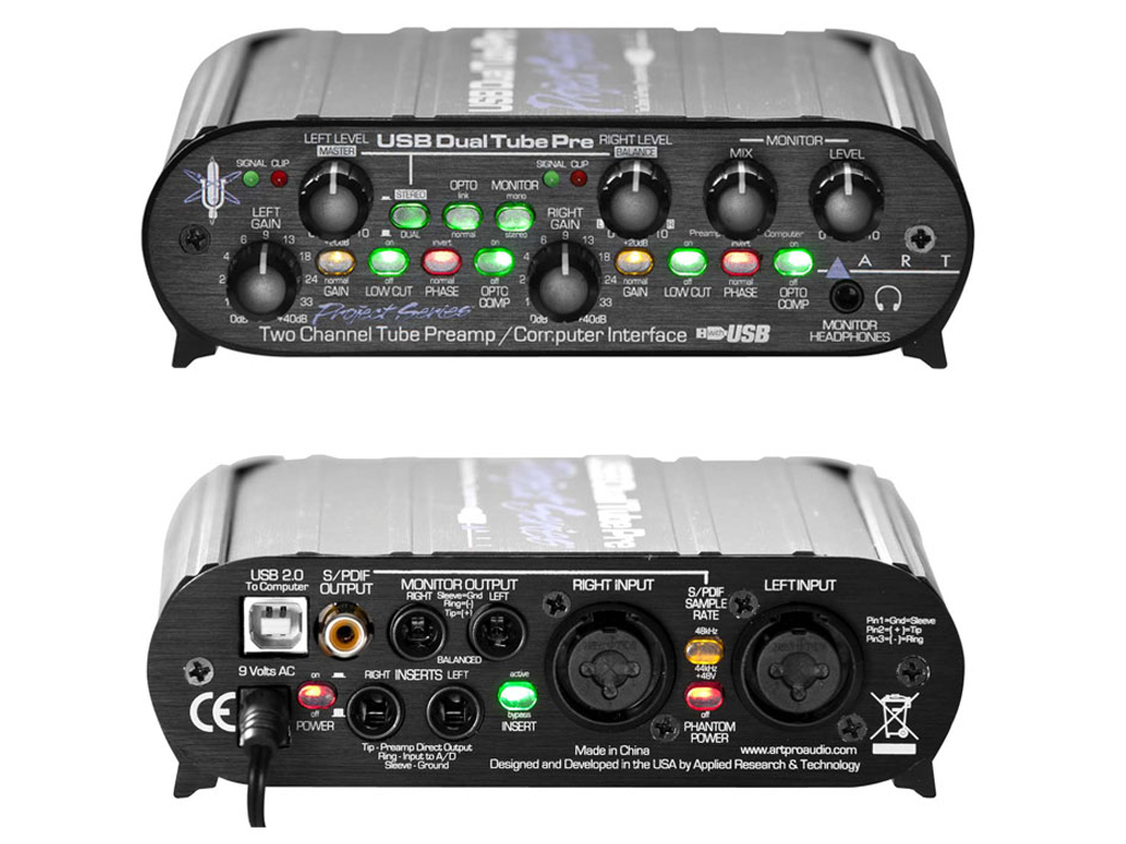USB Dual Tube Pre è l'ultimo preamplificatore valvolare compatto a due canali che ART Pro Audio ha progettato per l'implementazione in qualsiasi sistema di registrazione. Fruibile come unità autonoma con interfaccia audio USB integrata, o come espansione per qualsiasi audio-system digitale in cui è presente un ingresso in formato S/PDIF, ciascun canale di USBDualTube Pre offre un suono valvolare di qualità superiore e un'architettura d'ingresso completa ed evoluta. Ogni stadio di ingresso di USBDualTubePre mette a disposizione: controllo di guadagno e regolazione del livello in uscita, invertitore di fase, filtro Low Cut, alimentazione Phantom a 48V e un compressore ottico commutabile on/off in grado di assicurare un controllo accurato della dinamica di qualsiasi sorgente. Per il monitoraggio, una presa cuffie su minijack TRS da 1/8" completa di controlli di livello e mix consente di monitorare senza latenza la sorgente in ingresso durante la registrazione, così come la riproduzione dell'audio veicolato via USB tramite il computer. Il monitoraggio del mix è indirizzato anche alle uscite bilanciate su jack TRS da 1/4" ed è regolabile tramite il controllo di livello separato per la Control Room. L'interfaccia USB risponde appieno alle specifiche dell'omonimo protocollo di comunicazione e non richiede driver specifici per l'installazione.
