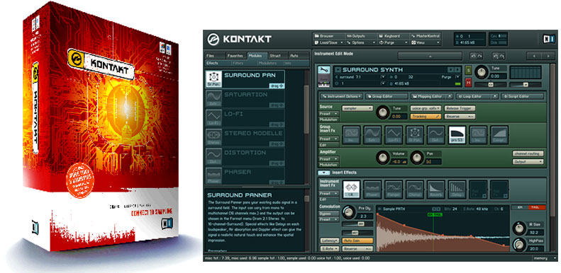 KONTAKT combina un'interfaccia semplice ed intuitiva con un'incredibile varietà di funzioni che ridisegnano lo standard del campionamento professionale. KONTAKT supporta tutti i più comuni formati e, oltre a fornire tutte le caratteristiche di un moderno campionatore, include nuovissime e potentissime funzioni. Può funzionare in due differenti modalità: Time-Machine e Tone-Machine. Grazie alla Time-Machine è possibile modificare, in tempo reale ed indipendentemente, la lunghezza, il pitch e le formanti di ogni campione. In modalità Tone-Machine è invece possibile imprimere ad ogni campione una determinata altezza, diversa da quella originale, con la possibilità di dare un'identità "musicale" anche a campioni che ne sono privi. Le potenti funzioni di time-stretching e pitch-shifting in tempo reale, la gestione grafica degli inviluppi, il loop editor integrato, 17 filtri a modelli analogici, la gestione grafica delle modulazioni e la sezione effetti integrata comprendente EQ, distorsori, delay e riverberi, rendono possibile la creazione di suoni assolutamente nuovi e originali. Potentissima anche la sezione dedicata alla modulazione con LFO, inviluppi, step modulator, tutti pilotabili e sincronizzabili via MIDI. Inoltre, a completamento del tutto, è inclusa nel pacchetto una sostanziosa libreria di campioni contenente più di tre gigabyte di suoni in vari stili e categorie.