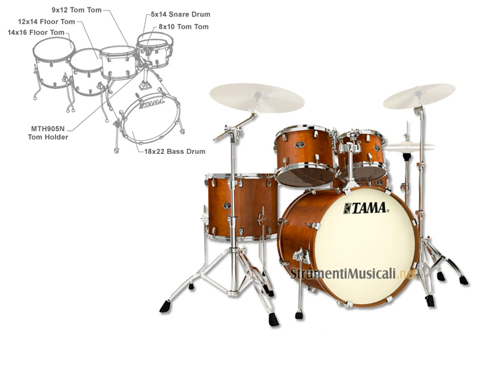 • Kit (6 pezzi): Cassa 22"x18", Tom 10"x08", Tom 12"x09", Timpano 14"x12", Timpano 16"x14", rullante 14"x5"