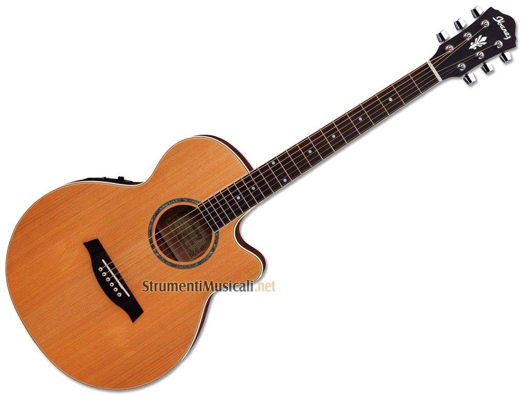 Chitarra elettroacustica con tavola in cedro, fondo e fasce in mogano, preamplificatore Ibanez SST con accordatore.