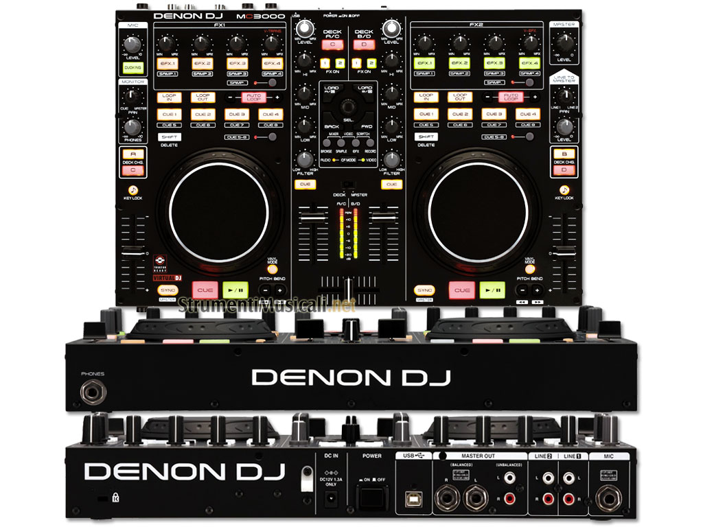 MC3000 è il nuovo DJ controller Denon sviluppato per integrarsi con Traktor 2 della Native Instruments (incluso nella confezione), e completamente ottimizzato per Virtual DJ. Offre il controllo di 4 canali ed una scheda audio integrata di qualità altissima, rendendolo perfetto per i DJ che ricercano un prodotto professionale all-in-one, lasciando però la possibilità di collegare ulteriori interfacce audio, grazie ai 2 ingressi di linea analogici. La qualità dei componenti Denon garantisce professionalità e sensibilità al tocco, grazie alle Jog Wheels da 105mm ed ai fader da 100mm. L'MC3000 è ottimizzato per l'utilizzo combinato con TRAKTOR 2, grazie ai pulsanti dedicati per il controllo del software, come SAMP, EFX nonchè la possibilità di sfogliare e navigare facilmente tra i files attraverso i knob rotativi.