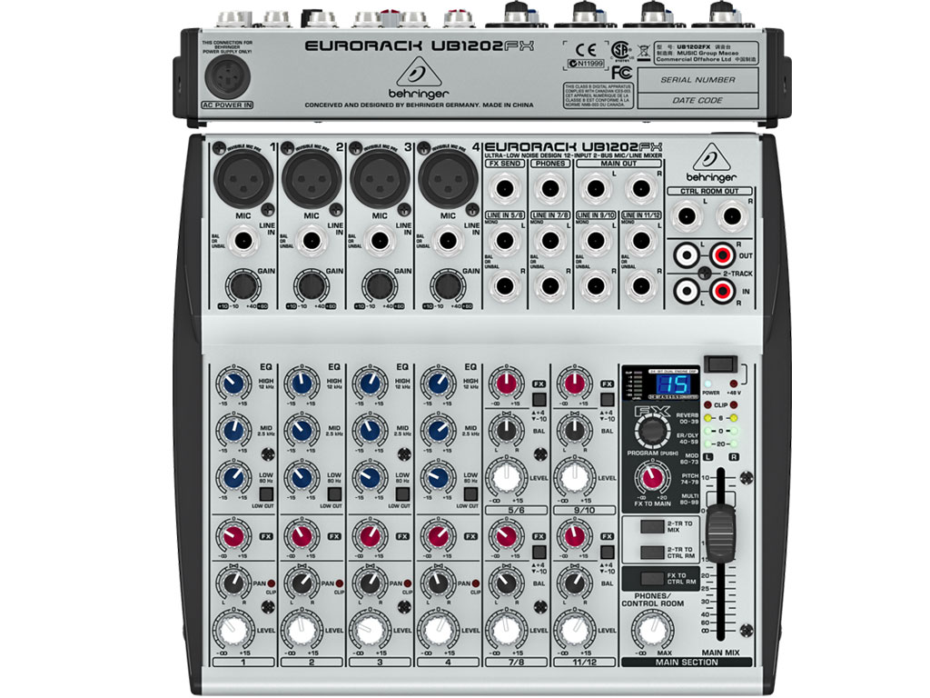 Il mixer Behringer UB1202FX 12-ingressi, 2 bus mic/line dispone di un processore multieffetti 24-bit/40 kHz con 100 preset incredibili, tra cui riverbero, chorus, flanger, delay, pitch shifter, etc. In questo mixer compatto sono presenti preamplificatori microfonici state-of-the-art, un circuito a bassissimo rumore, un EQ a 3 bande ed in più un filtro low-cut su tutti i canali mono, caratteristiche che hanno dato all'intera serie UB tantissimo successo. L'UB1202FX è un mixer versatile, con possibili applicazioni che vanno dal collegamento di registratori DAT e monitor all'esecuzione di video ed alle installazioni audio.
