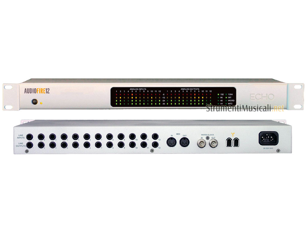 Echo AudioFire12 è una scheda audio FireWire potente e compatta con 12 In e 12 Out analogici bilanciati, DSP per Mixing digitale con monitoring Zero Latency e Wordclock. L'interfaccia è alimentata via bus FireWire o con alimentatore esterno. I convertitori consentono di gestire una risoluzione di 24bit/192 KHz con bassissima latenza sia sistemi Windows e Mac.