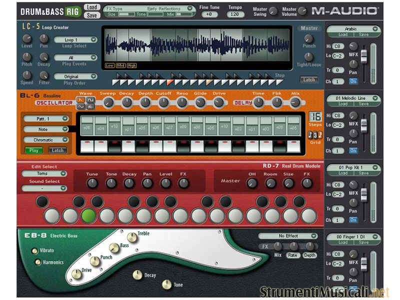 • 4 moduli sonori virtuali di alta qualità: LC-5 Loop Creator, BL-6 Bassline, RD-7 Real Drum Module, EB-8 Electric Bass.