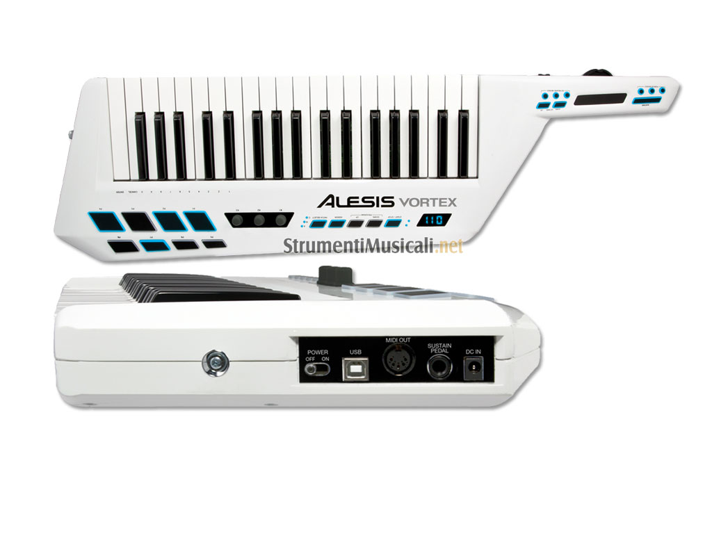 Elimina le barriere tra te e il pubblico, scendi nella mischia con il nuovo controller USB/MIDI a tastiera Vortex By Alesis. Ricco di controlli, questo nuovo MIDI Controller unisce caratteristiche innovative per la gestione dei parametri, ad una tastiera a tracolla da utilizzare durante le tue perfomance dal vivo. Vortex ti permetterà di suonare qualsiasi strumento hardware e software via MIDI o USB, senza limiti sonori, se non quelli della tua creatività. Potrai intervenire sul pitch bend, applicare dei vibrato, agire sul cut-off di un filtro, etc. Vortex risponderà ai tuoi movimenti. Alesis Vortex include caratteristiche uniche, mai viste prima in un keytar: uscita MIDI DIN tradizionale, USB/MIDI per il collegamento a computer Mac, PC e iOS Device. Potrai controllare tutti gli strumenti hardware e software disponibili in commercio, grazie a mappature preimpostate. In più, sarai libero di programmare e assegnare i controlli MIDI a tuo piacimento. La collocazione ergonomica dei controlli sul manico semplifica e rende possibili operazioni di editing real-time contemporaneo di più parametri, come lo slider per il controllo del volume, la ruota del pitch bend e di altri nove controlli: il touch strip MIDI assegnabile e i pulsanti per il cambio di ottava e sustain. I controlli di trasporto e selezione patch sono collocati centralmente nel corpo dello strumento, per un accesso immediato. La tastiera è una 37 tasti sensibili alla dinamica e con funzione aftertouch, per darti il controllo totale anche sui synth (hardware o software) più ricchi di sfumature. 8 sono i pad sensibili alla dinamica di ampie dimensioni, per il controllo di campioni, suoni di batteria, o per il lancio di clip. Vortex si alimenta tramite la porta USB del tuo computer Mac o PC, oppure a pile quando la vuoi utilizzare con strumenti MIDI hardware, o con device iOS come l'iPad. Sono disponibili i classici punti di fissaggio per le tracolla tradizionali per chitarra.
