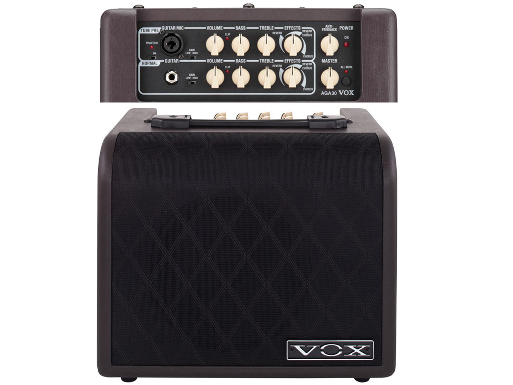 Il Vox AGA30 è dotato di due canali indipendenti, e ogni canale è dotato di sezione effetti, chorus e riverbero, necessari per suonare in acustico. La selezione simultanea degli effetti avviene a grazie ad un unica manopola (in grado di selezionare anche l'effetto di chorus e riverbero combinati) capace di determinarne la profondità per avere un suono adatto a svariate situazioni, da quella di casa allo studio al live. Ideale per chi suona in acustico, AGA30 mette in risalto le qualità di morbidezza e dolcezza dello strumento. Il canale Tube Pre, con la sua valvola preamplificatrice 12AU7, è dotato di ingressi standard per chitarra, che all'occorrenza può essere alimentato a 48V per ospitare un microfono: soluzione perfetta per il musicista cantante. Lo switch Lo-Z/Hi-Z su ogni canale permette di supportare infine vari livelli di segnale. Entrambi i canali sono dotati di sezione effetti che comprende un chorus e un riverbero selezionabili anche in simultanea, per arricchire la performance sonora e la spazialità dell'esecuzione. La possibilità di usare l'Aux In per connettere una fonte sonora esterna come un lettore MP3 e l'uscita Tuner/Direct per connettersi direttamente ad un sistema PA, rendono AGA30 ideale in ogni situazione, anche per registrare direttamente in un banco mixer, piuttosto che come spia sul palco. Il controllo Anti Feedback riduce il rumore di fondo e l'effetto di ritorno. Un pedale esterno rende inoltre possibile il controllo di bypass effetto o la messa in funzione degli stessi.