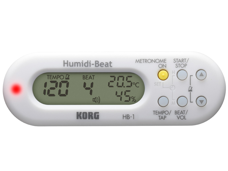 Metronomo portatile con tempistica adatta ad ogni tipo di musicista, termometro incluso, sensore di umidità e orologio per prendersi cura del proprio strumento, controllando la situazione nel case in viaggio o in deposito. In aggiunta al conteggio beat di range 0 a 9, Humidi-Beat possiede cinque diversi patterns: doppiato, terzinato e terzinato con beat interno muto, quartine e quartine con beat interni muti. In totale 15 variazioni stilistico/ritmiche possibili. L'Humidi-Beat è dotato di funzione di backup memoria e auto-spegnimento. Anche se spento Humidi-Beat ricorda le impostazioni scelte. La funzione di spegnimento automatico inoltre preserva la durata della batteria dopo quindici minuti di inutilizzo.