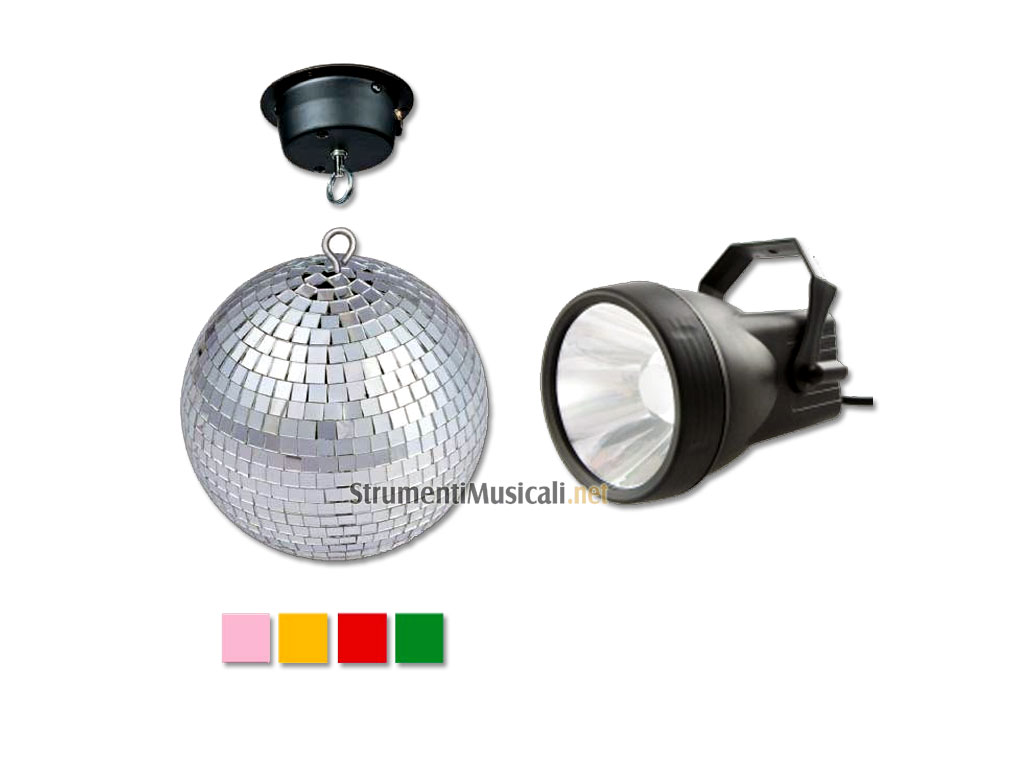 Confezione composta da una sfera a specchi da 20cm, 1 faro a led da 3W con fasci di luce molto concentrato, un motorino 220V per sfera a specchi e 4 gelatine colorate intercambiabili da applicare al faro. Una classica combinazione per ricreare l'ambiente festoso delle discoteche anni 80.