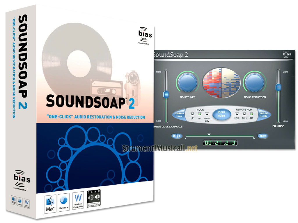 Sound Soap riduce in modo facile ed istantaneo il rumore dai vostri file digitali audio e video. Sarà sufficiente cliccare sul pulsante "Learn Noise", e SoundSoap automaticamente ripulirà il vostro audio. O in pochi secondi potrete regolare gli intuitivi controlli di SoundSoap per risultati ancora più professionali. Il controllo Noise Tuner vi aiuterà a trovare immediatamente la frequenza corretta da eliminare ed il pulsante Learn Noise regolerà automaticamente questo controllo. Inoltre grazie al pulsante Remove Rumble, SoundSoap eliminerà qualunque rumore fastidioso sotto i 40hz. Selezionando poi il "Mode" corretto, potrete decidere se ascoltare il suono in Bypass, il suono ripulito, o solo il rumore che state eliminando. In modalità standalone, SoundSoap può funzionare come un'applicazione a se stante e può processare il suono nei più comuni formati video o audio - incluso QuickTime, DV (formato delle videocamere digitali), .AVI, .WAV, AIFF, ed anche MP3.