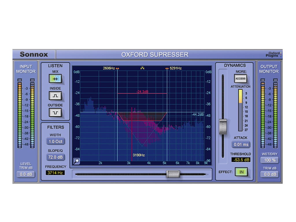 L'Oxford SuprEsser è un DeEsser molto professionale abbinato ad un EQ dinamico. Può essere utilizzato in due modalità: la prima è semplice e veloce, con i maggiori parametri sotto controllo, la seconda è una modalità avanzata con maggiori controlli per una funzionalità avanzata. La combinazione di un display FFT intuitivo con tre modalità di ascolto consentono all'utente di visualizzare e sentire con estrema precisione le frequenze "problematiche", e di intervenire con rapidità nella riduzione o eliminazione del problema audio riscontrato. Poichè il SuprEsser può operare a tutte le frequenze, le consonanti "esplosive" e le frequenze fastidiose vengono rimosse senza fatica, questo rende il SuprEsser un qualcosa di più di un semplice DeEsser. Le caratteristiche supplementari includono l'Automatic Level Tracking, il Linear Phase Filtering e la possibilità di miscelare il segnale Wet/Dry per maggior controllo sul bilanciamento finale.