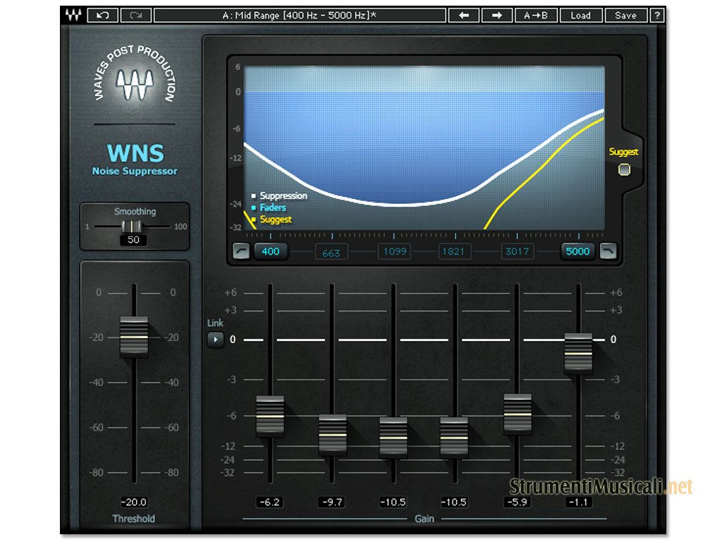 WNS Waves Noise Suppressor è un plug-in di riduzione del rumore in tempo reale specificatamente progettato per il lavoro sulle tracce vocali. Indicato per la rimozione del rumore su registrazioni effettuate in interni o in esterni con rumori di tipo "stabile" o modulato, il WNS è stato progettato per ridurre il rumore da dialoghi, narrazioni, voiceovers, e broadcast, con i minimi artefatti. WNS dispone di 6 bande di intervento definibili dall'utente e di un grande display grafico. Progettato soprattutto per i professionisti della post produzione, l'approccio al flusso di lavoro e l'interfaccia del WNS sarà subito familiare agli ingegneri della post produzione. WNS offre tutta la flessibilità, la portabilità, la potenza e la precisione del software, tra cui una vera integrazione di Pro Tools, più istanze simultanee e l'automazione completa.