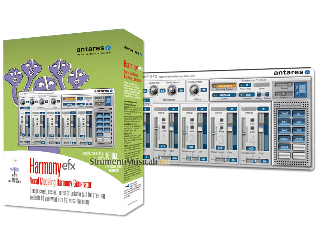 Harmony EFX è una versione semplificata ed estremamente efficace del generatore di armonie vocali Antares Harmony Engine Evo. Basato sulla stessa tecnologia Evo Voice Processing del fratello maggiore, Harmony EFX rende disponibili arrangiamenti vocali di qualità professionale per tutti. Tradizionalmente i tool di armonizzazione offrivano soltanto due modalità di operazione di base: un'opzione era quella del tutto automatica basata su intervalli di scala paralleli - relativamente facile da configurare però con poche possibilità nel controllo creativo. Una seconda opzione era quella della modalità MIDI che controllava ogni singola nota come voce dell'armonizzazione - tecnica questa che offriva un assoluto controllo, ma di contro richiedeva un'ottima preparazione come arrangiatore vocale e, ovviamente, anche molto più tempo e pazienza per inserire ogni singola nota nella traccia MIDI. Con Harmony EFX, il software crea automaticamente uno strumento che permetta di sentire l'armonizzazione desiderata, inserendo in modo semplice e veloce l'armonizzazione all'interno del progetto.