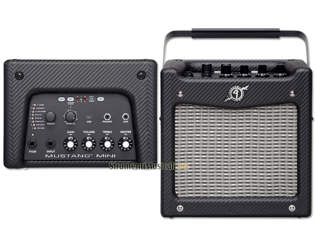Fender presenta il nuovo membro della famiglia Mustang, il piccolo Mustang Mini. Ultra-trasportabile e ultra-versatile, il Mustang Mini e' l'ampli ideale per andare ovunque e suonare ovunque. Il Mustang Mini racchiude il meglio della tecnologia Fender in un formato piccolissimo e compatto, con un singolo cono da 6,5" e 7 watt di potenza. Questo incredibile amplificatore comprende 24 preset realizzati sulla base di otto modelli di amplificatori e di dozzine di modelli di effetti digitali, ed e' dotato di connettività semplice e immediata al computer e di software Fender FUSE™ per l'editing approfondito, per lo scambio di preset con utenti in rete e per l'upload di preset programmati da famosi artisti. E' inoltre dotato di uscita cuffie, ingresso ausiliario, porta e cavo USB per interfacciarsi al computer e per la registrazione in streaming, manopole digitali programmabili che comprendono controlli di gain e treble, pulsante "tap" per sincronizzare delay e modulazioni, pulsante "save" per salvare i propri preset, accordatore, maniglia e meccanismo per inclinarlo, speciale look Mustang "carbon-tweed", alimentatore di corrente AC e possibilita' di funzionamento a batterie.