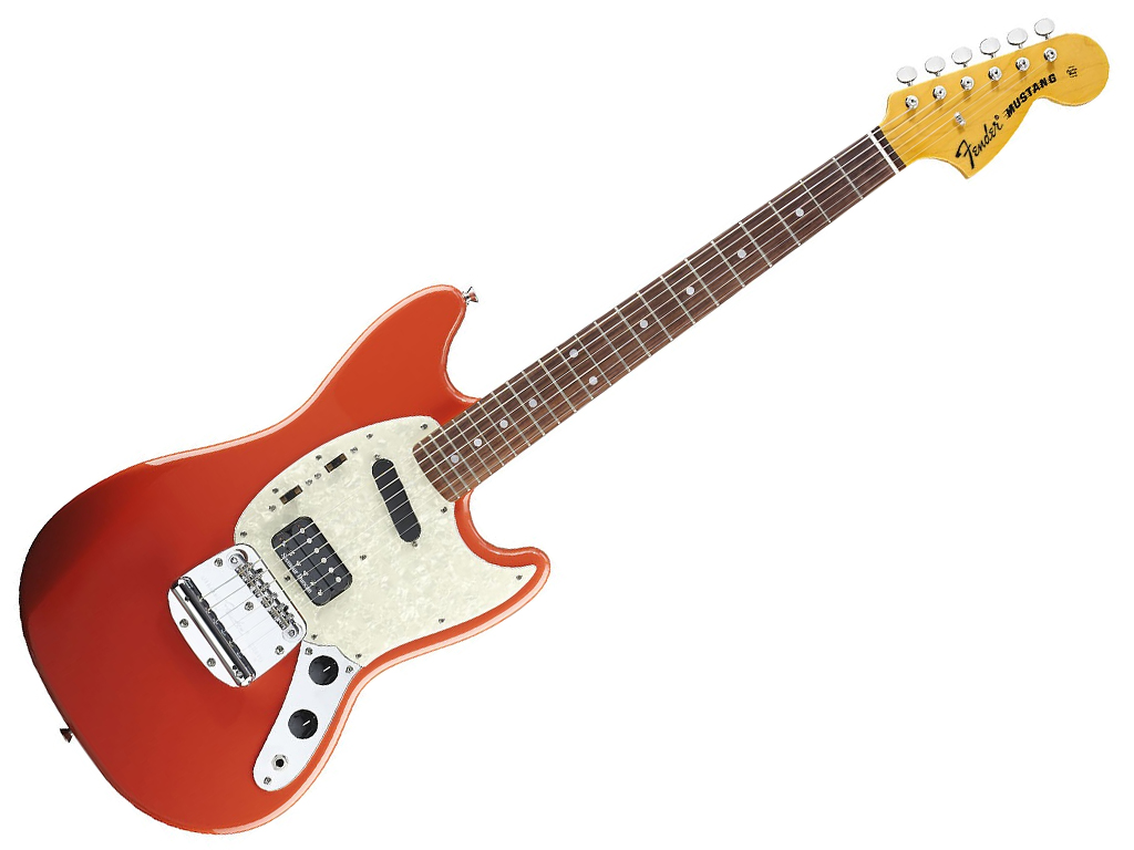 La Fender Kurt Cobain Mustang rievoca l'uomo, la band e le sonorità di quel periodo, ed è nata per trovarsi nell'occhio di un nuovo ciclone musicale. Cobain amava le Mustang. Per prima cosa, prediligeva strumenti vecchi e vissuti ma che non costassero una fortuna, e la Mustang rispondeva benissimo a entrambi i requisiti. Inoltre prediligeva strumenti come le Fender Mustang e Jaguar perchè ben si adattavano alle sue mani piccole. Ispirata ad un arsenale di Mustang modificate, la Fender Kurt Cobain Mustang vi riporta dritti a quel periodo, grazie a caratteristiche quali un pickup single-coil Mustang angolato al manico e un feroce humbucker Seymour Duncan JB al ponte, montato direttamente sul corpo, due selettori on-off/phase in-out per ciascun pickup, il corpo in ontano con finitura in poliestere, il ponte Adjusto-Matic con vibrato dinamico. La chitarra ha poi scala da 24", manico in acero dal profilo a "C" con finitura uretanica, tastiera in palissandro con raggio di curvatura da 7.25", 22 tasti vintage e segnatasti vintage-style ivory dot, battipenna a quattro strati Aged White Pearl, controlli di master volume e tono, meccaniche vintage-style, hardware cromato.