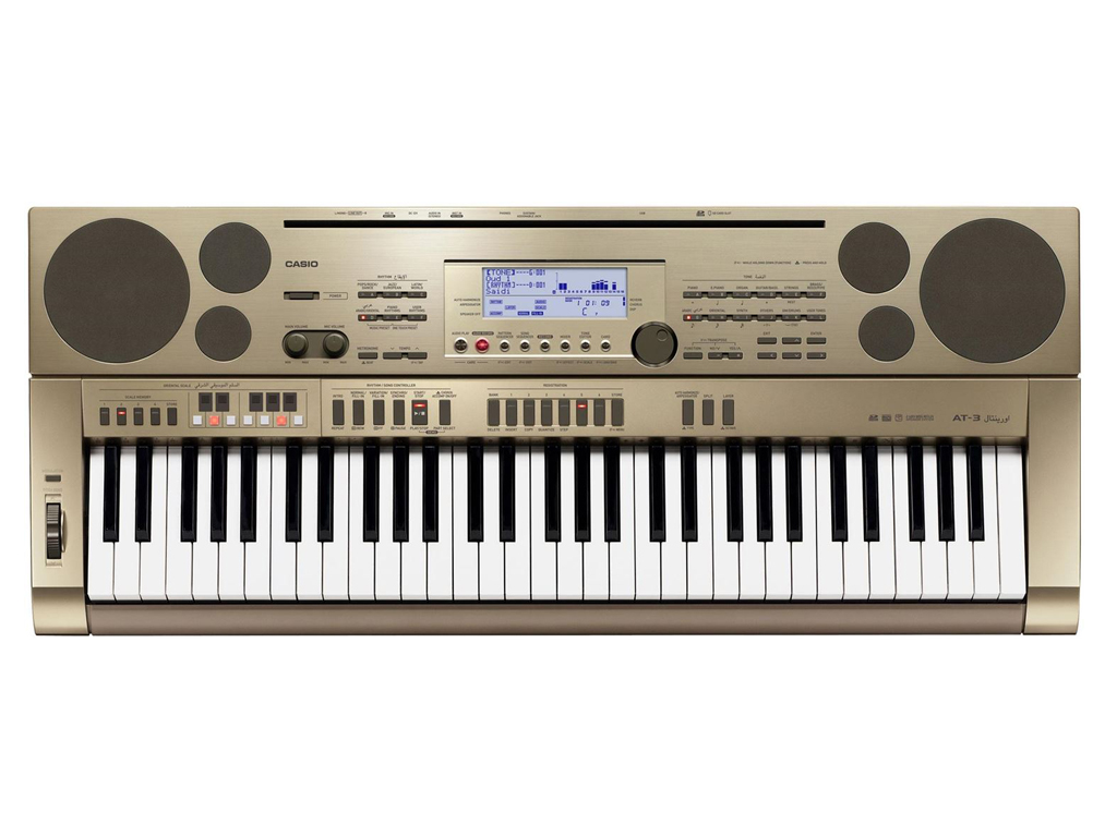 La tastiera orientale AT-3 è dotata di una grande quantità di ritmi orientali e consente all'esecutore di impostare sulla tastiera scale di quarti di tono memorizzabili con la funzione Memory. Nello sviluppo di suoni e stili orientali si è prestata particolare attenzione alla loro autenticità e sonorità. È così garantita una scelta infinita di sound! I pulsanti Oriental Scale consentono al musicista di selezionare diversi esempi di scale e di creare le proprie scale regolando con precisione la tonalità delle note. È così possibile riprodurre con autenticità la scala araba, con i suoi tipici toni che si posizionano "tra"gli intervalli delle ottave di pianoforte. Grazie al corpo color oro e alle scritte in arabo, l'AT-3 ha un carattere musicale del tutto particolare.