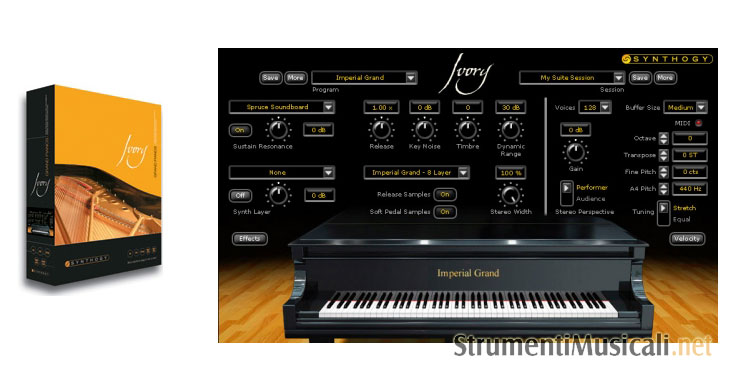 Ivory Grand Pianos 1.7 è un potentissimo strumento virtuale dedicato espressamente al pianoforte. Oltre 3.500 campioni sono stati combinati in un motore audio specificatamente concepito per esaltare al massimo le caratteristiche del pianoforte, dandone svariate possibilità di controllo: dalla risonanza tra le corde al rumore meccanico dei martelletti, dall'accordatura alla gestione del timbro, ecc. I 3 pianoforti inclusi (Steinway D 9' Concert Grand, Bosendorfer 290 Imperial Grand, Yamaha C7 Grand) sono stati registrati senza compromessi nei migliori studi e nelle migliori sale da concerto e garantiscono un suono eccezionale. Con Ivory Grand Pianos per la prima volta avrete realmente l'impressione di suonare un vero pianoforte a coda. I 3 pianoforti inclusi (Steinway D 9' Concert Grand, Bosendorfer 290 Imperial Grand, Yamaha C7 Grand) sono stati registrati senza compromessi nei migliori studi e nelle migliori sale da concerto e garantiscono un suono eccezionale. Con Ivory Grand Pianos per la prima volta avrete realmente l'impressione di suonare un vero pianoforte a coda.