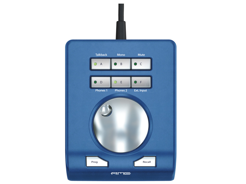 L'Advanced Remote Control (ARC) è stato concepito per avere l'accesso diretto alle azioni ed ai comandi più utilizzati, e rende più semplice e rapido il lavoro di tutti i giorni con le interfacce RME. La configurazione è molto semplice e avviene all'interno del TotalMix FX. L'ARC ha un robusto chassis metallico con un encoder principale, 2 pulsanti e 6 pulsanti con LED. Il Remote Control viene collegato all'interfaccia audio attraverso un cavo da 5m e un connettore speciale sul pannello posteriore delle schede. Sul pannello superiore dell'ARC si trova un encoder rotativo con funzione di pulsante, 2 pulsanti inferiori e 6 pulsanti superiori con LED di stato. L'encoder rotativo può essere usato per modificare diversi parametri come il guadagno e il volume. Il pulsante sinistro Prog è programmabile, e può eseguire diverse funzioni. Lo stesso vale per i 6 pulsanti che hanno anche un LED che indica lo stato attuale. L'ARC fornisce impostazioni di fabbrica per i 7 pulsanti programmabili, ma può essere configurato a piacere dalla finestra Key Commands del TotalMix FX. Il comportamento di ogni pulsante (push, toggle, attiva e disattiva) varia in base alla funzione selezionata. E' possibile anche attivare diverse funzioni contemporaneamente. Esempio: sul pulsante A è impostata la funzione Cue Phones 1. Questo significa che quando viene premuto, è possibile ascoltare il submix delle cuffie attraverso l'uscita Main (i monitor). Ora per poter modificare il volume del submix delle cuffie, assegnate al pulsante B la funzione Volume Phones 1. Premendo entrambi i pulsanti potete ascoltare il submix delle cuffie nell'uscita monitor, e modificarne in volume (il fader della terza fila) ruotando l'encoder. Quando la Fireface UCX e UFX vengono usate in modalità stand-alone, il TotalMix FX sul computer non è più disponibile, e dunque non lo sono nemmeno le impostazioni di configurazione dell'ARC.