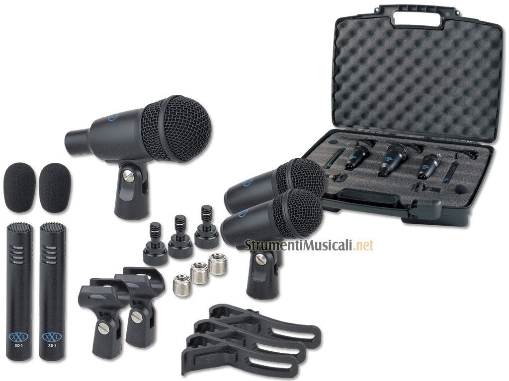 L'XD1 è un set con cinque microfoni professionali per darvi una soluzione base ma professionale per l'amplificazione della batteria, ideale per tutte le esigenze in studio e dal vivo. Una robusta valigetta in plastica racchiude: 1 microfono dinamico a diaframma grande (da usare per la cassa); 2 microfoni dinamici a diaframma piccolo (da usare per rullante e/o tom) e 2 microfoni a condensatore (da usare come "panoramici"), oltre ai supporti specifici per ogni microfono. Per integrare questa soluzione suggeriamo il nostro XS57 per il rullante ed il nostro XC58 da usare sul timpano, a meno che non decidiate di lavorare con un microfono a diaframma piccolo fra i tom piccolo e medio, lasciando l'altro microfono a diaframma piccolo per il timpano.
