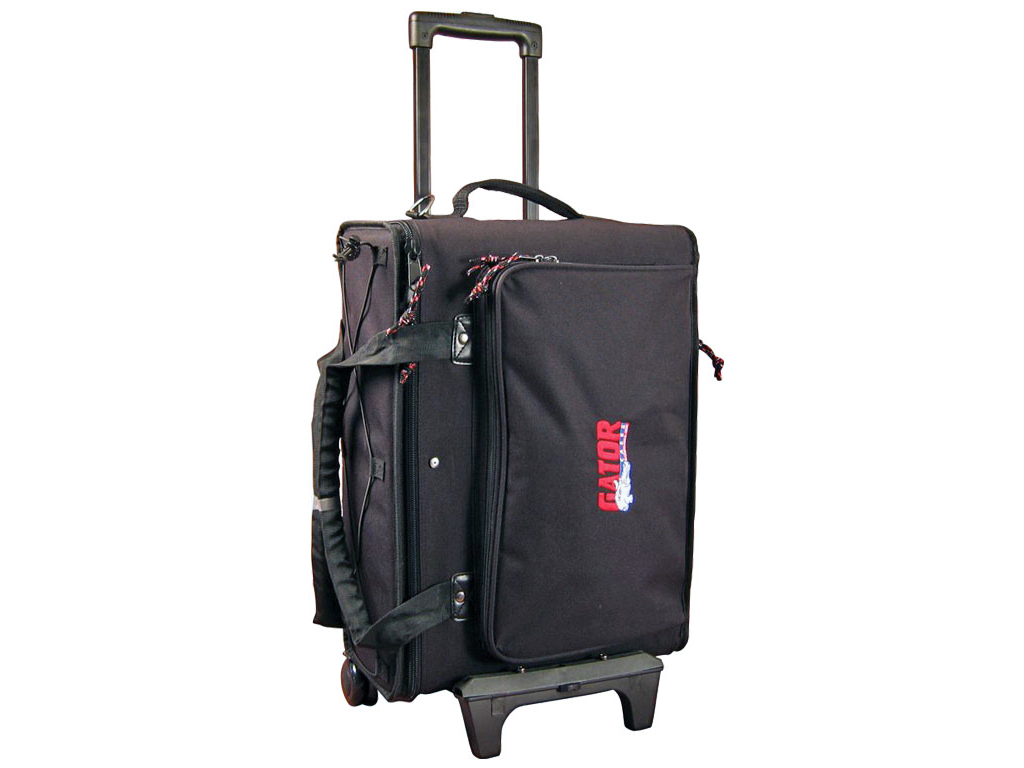 Trolley per rack 4U dotato di ruote e maniglia di traino a scomparsa, telaio in polietilene e rivestimento in Nylon 600D.
