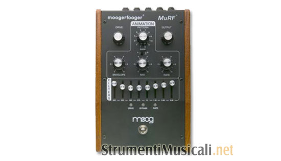Il Moogerfooger MF-105 MuRF è la soluzione definitiva per chiunque sia alla ricerca di un effetto nuovo e mai fino ad ora realizzato: sia che suoniate la chitarra, il basso, le tastiere o per il vostro lavoro in studio, con MuRF potrete rigenerare e arricchire qualsiasi sorgente sonora. MuRF è l'acronimo di "Multiple Resonance Filter Array, vale a dire una rete di filtri risonanti multipli. Per l'esattezza MuRF dispone di 8 filtri, ciascuno controllato da 8 cursori di livello. L'aspetto è quello di un equalizzatore grafico, ma il suono dei filtri è nettamente diverso: avrete il massimo del calore e della 'risonanza' analogica. L'aspetto assolutamente unico è la possibilità di animare i livelli degli 8 filtri con fino a 24 preset dei pattern. Il rate dei pattern è impostabile tramite un potenziometro, da un pedale d'espressione, o con la connessione di un interruttore a pedale dall'ingresso 'tap tempo' per far corrispondere il rate al tempo della vostra song. Si possono creare le variazioni ritmiche regolando i livelli dei filtri e il controllo Envelope definisce la forma della modulazione, che può essere impostata per filtrare delle modulazioni di ritmiche techno o per un morphing timbrico straordinario. Gli altri controlli prevedono anche l'Input Drive, il livello di uscita e il Mix Wet/Dry. MuRF integra le specifiche e le caratteristiche 'musician-oriented' tipiche di tutta la linea dei prodotti Moogerfooger. Il processamento del segnale audio è al 100% analogico, per una resa sonora senza precedenti e con il massimo del 'calore'. Qualisasi segnale audio di linea o di uno strumento può essere processato. Un'ampia gamma di parametri per l'esecutore possono essere controllati dalle manopole sul pannello così come dai pedali di espressione o da strumenti analogici di sintesi compatibili con il controllo in tensione CV. La componentistica è di primo livello ed a prova di durata, in previsione di utilizzi frequenti in studio e dal vivo. Il MuRF risiede nel classico involucro Moogerfooger a 'chiusura doppia' che ne consente un utilizzo ottimale sul pavimento o su qualsiasi altro piano di appoggio.