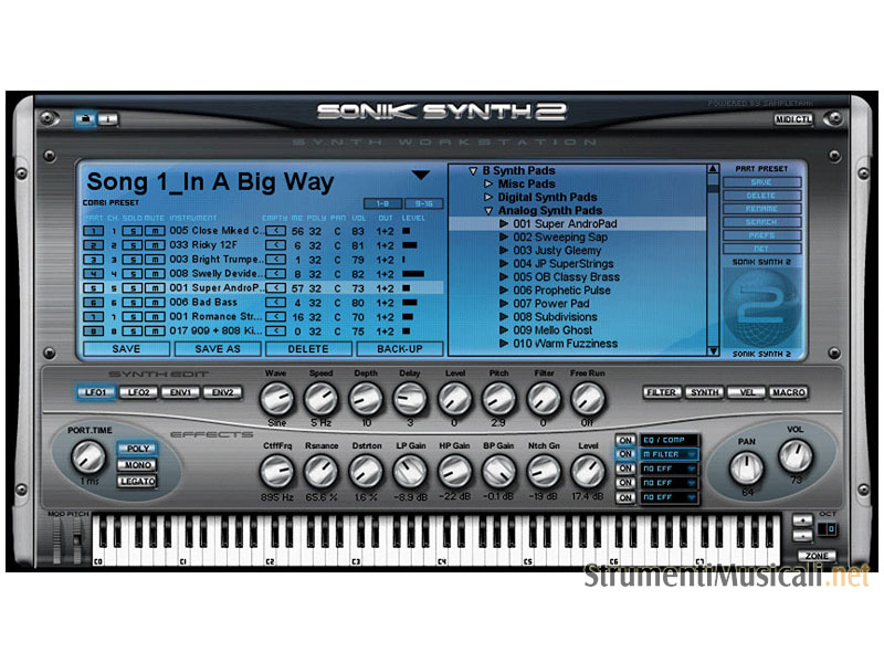 Sonik Synth 2 è focalizzato su tutti i tipi di synth, più di 8GB di campioni e 5800 suoni che spaziano dai modelli vintage sia analogici che digitali alle moderne workstation.