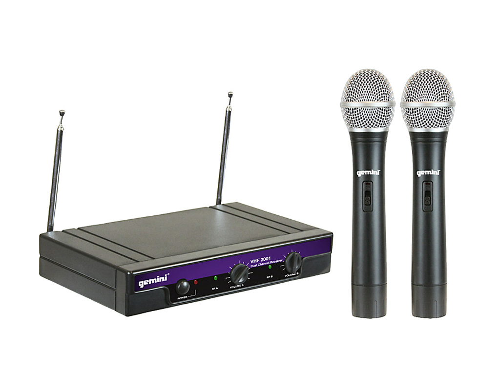 I sistemi Gemini VHF-2001 dual-channel rendono la libertà wireless più accessibile che mai, ed offrono una chiara e naturale qualità del suono. La serie VHF fornisce tutto il necessario per disfarsi dei cavi. Disponibile in due configurazioni versatili, i sistemi Gemini VHF offrono una soluzione per quasi ogni applicazione. Entrambi i sistemi includono due trasmettitori a singolo canale, che operano su diverse frequenze, e trasmettono ad una sola unità che ospita entrambi i ricevitori, ognuno con la sua uscita separata. C'è anche un controllo di livello singolo per ogni canale. Il VHF-2001M è dotato di due microfoni dinamici unidirezionali palmari, con capsule cardioide ad alta sensibilità, per una riproduzione della voce estremamente accurata. Per garantire una maggiore affidabilità ed un audio senza soluzione di continuità, i trasmettitori dispongono anche di meccanismi di assorbimento del rumore per eliminare il rischio di switch-shock e il rumore dovuto al maneggiamento, rendendo il sistema ideale per cantanti e DJ.