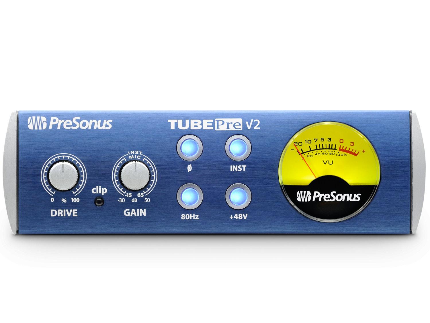 Presonus ha deciso di modernizzare la propria creazione con il TubePre V2, focalizzandosi sul miglioramento ulteriore del già ottimo preamplificatore microfonico senza per questo gravare sul prezzo. Come la versione originale, questo nuovo TubePre, è un preamplificatore professionale a valvole, con un controllo del guadagno dual-servo (nessun condensatore) che permette di aumentare il livello in modo significativo senza incrementare parallelamente il rumore di fondo. I componenti discreti di cui è composto ed alte alimentazioni, garantiscono una gamma dinamica ed un dettaglio assolutamente sconosciute ad altri preamplidficatori di questa fascia di prezzo. Il preamplificatore microfonico a bordo è l'ormai noto PreSonus XMAX, in Classe A, a stato solido, seguito da uno stage valvolare (12AX7). E' sufficiente ruotare il controllo di saturazione (DRIVE) sul TubePre V2 per aggiungere colore al segnale. Quel colore, e calore, che solo una valvola 12AX7 può aggiungere. Dotato di un case solido e robusto, il TubePre V2 è dotato di uscita bilanciata (su connettore XLR/Cannon) e sbilanciata (su jack), e di ingresso bilanciato (su connettore XLR/Cannon) e sbilanciato (su jack). E' stato incluso tutto il necessario: un filtro passa-alto, l'alimentazione phantom (48 volt) per i microfoni a condensatore, uno switch per l'inversione di fase, ed un VU Meter retroilluminato. Il TubePre V2 è molto più che un semplice preamplificatore microfonico. Grazie ai suoi ingressi separati (Mic e Instrument) può essere utilizzata come un DI Box per chitarre e bassi. E' sufficientemente piccolo e compatto per essere trasportato ovunque.