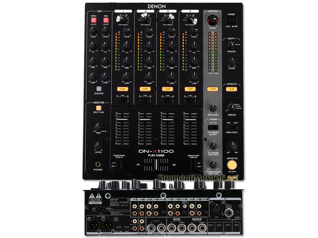 Diversamente da altri mixer analogici, il DN-X1100 utilizza una matrice di assegnazione degli ingressi che permette ai DJ di assegnare liberamente gli 8 diversi ingressi su ciascun canale, o persino a canali multipli, dando una flessibilità di utilizzo sino ad ora non conosciuta. In aggiunta ai suoi otto ingressi analogici e tre phono selezionabili, il DN-X1100 è dotato di un Flex Fader (crossfader) ad elavata reattività con regolazione della tensione e controllo contour. Vi sono 4 canali su slider, ciascuno è dotato di fader 60mm VCA ad alta precisione mentre il cross fader, con sezione A-B assegnabile, è dotato di fader VCA 45mm anch'esso con regolazione contour. Il fader start del canale è compatibile con i lettori CD/MP3/ Media Denon.