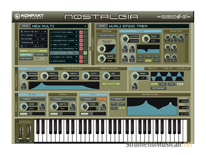 NOSTALGIA è il nuovo virtual instrument della ZERO-G con motore software della Native Instruments, contenente oltre 1.3 gigabyte di suoni e oltre 1.300 patch provenienti da più di 40 diversi strumenti elettronici. Il geniale mago della programmazione STEVE HOWELL ha infuso tutta la sua pluri-trentennale esperienza e conoscenza di questi vari strumenti per creare quella che può essere considerata una delle migliori e più accurata rappresentazione virtuale di alcuni dei più grandi synth, tastiere e beat box mai esistiti e da lui utilizzati in qualità di sound designer, sound engineer, esecutore o compositore. Steve ha anche attinto dagli oltre suoi 16 anni di attività nello sviluppo di librerie di campioni per creare una libreria con un alto grado di ottimizzazione e particolarmente efficiente nell'uso della memoria - oltre 40 anni di innovazioni e tutto lo spirito pionieristico di allora (spesso dal sapore un po' naif) racchiuso in una completa collezione il cui nome non poteva non essere che ' NOSTALGIA '! Qualsiasi genere musicale voi frequentiate ci sarà sempre un posto per questi suoni nella vostra musica. Potrete trovare sonorità lo-fi di antiche beatbox, imponenti suoni Gothic Tron, i morbidi pad e strings del Prophet, i suoni profondi e pieni dei bassi o lead del Moog, i più classici fra i piani elettrici, vorticosi string synth, campionatori classici, i primi synth digitali, e tutto quanto possiate immaginare ... - con oltre 5.000 campioni e più di 1.300 patch, si tratta probabilmente della più massiccia collezione per Kompakt che contenga 40 anni di storia al suo interno. L'intera libreria è resa disponibile all'interno dell'interfaccia del noto campionatore allo stato dell'arte KOMPAKT INSTRUMENT, per non scendere ad alcun compromesso in termini di suonabilità nella gestione di uno strumento basato su campioni. Potenti filtri multi-mode, inviluppi e LFO danno a questa libreria un'enorme flessibilità e un mondo di possibilità creative. Gli effetti integrati di alto livello quali il riverbero, chorus e delay sono in grado di fornire vitalità e profondità a ciascun campione. Scoprirete che l'intuitiva e pulita interfaccia di KOMPAKT INSTRUMENT non permetterà al vostro estro creativo di essere sottomesso da una pur così grande tecnologia! Tutti i parametri più importanti degli strumenti possono essere immediatamente regolati senza la necessità di cambiare pagina, effettuare scrolling o prendere in mano un manuale! Tutti i suoni sono stati registrati e processati alla risoluzione di 16 Bit con una frequenza di campionamento di 44.1KHz.