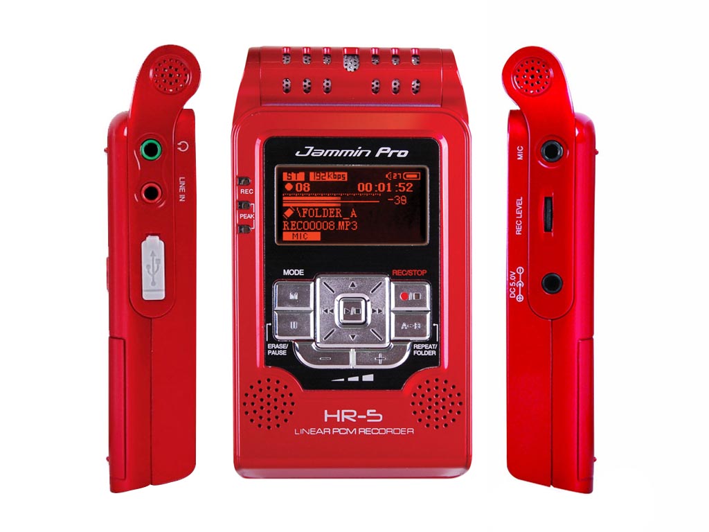 JamminPro HR5 è un registratore digitale stereo portatile e ultracompatto adatto a registrazioni vocali o musicali di qualità. E' dotato di una memoria interna HDD da 2GB, capace ci contenere più di 35 ore di registrazione e supporta card SD/SDHC ad alta capicità. E' possibile registrare con risoluzione a 24-bit ed un ampia gamma dinamica ( frequenze di campionamento fino a 96 Khz ) che garantiscono una definizione più che doppia rispetto a quella ottenibile con un CD Audio. HR5 monta un doppio microfono a condensatore per l'effetto stereo e un piccolo speaker stereo ottimizzato per monitorare le proprie registrazioni. Completano il prodotto funzioni come Auto Gain Control ( in presenza di volume troppo basso ne viene innalzato il livello automaticamente ), indicatori di livello e di picco e la funzione VOX (Voice Activated Recording) che fa attivare il registratore al verificarsi di un evento sonoro superiore a una soglia prefissata.