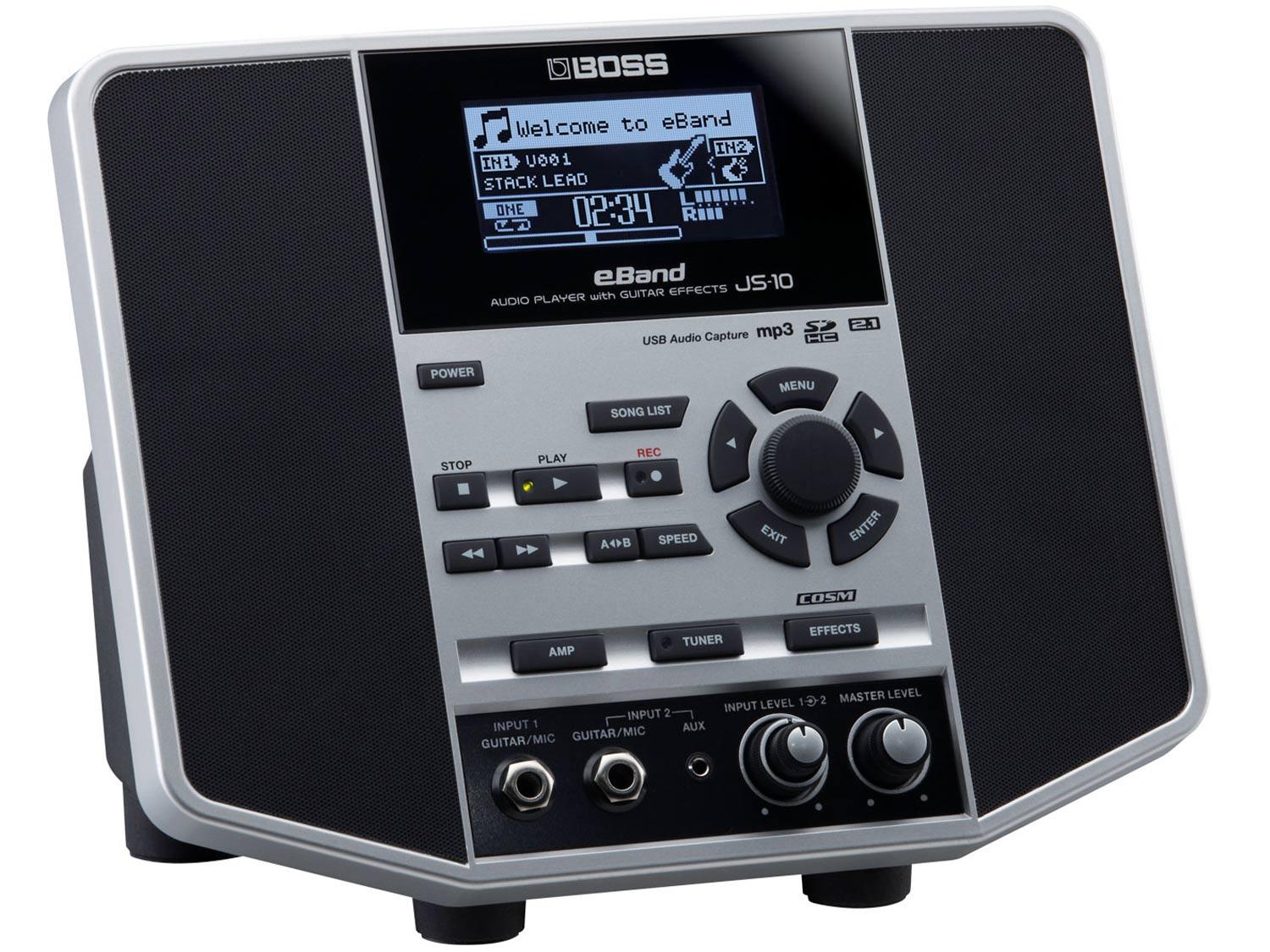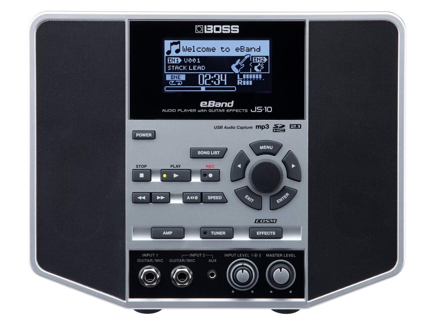 Collega una chitarra, un basso o un microfono nel nuovo eBand BOSS e divertiti con i tuoi amici o la tua famiglia! JS-10 è di piccole dimensioni, ma il suo suono è molto potente grazie al sistema di diffusione del suono 2.1 e agli effetti di qualità BOSS. E' possibile suonare su un'ampia selezioni di canzoni e loop audio, cosi come riprodurre una canzone via USB o SD card. Inoltre possono essere cambiate sia la velocità che la tonalità di una qualsiasi song con ottimi risultati, e per finire si possono registrare le proprie performance. eBand è compatto, dispone di caratteristiche pro ed ha un suono eccezionale.