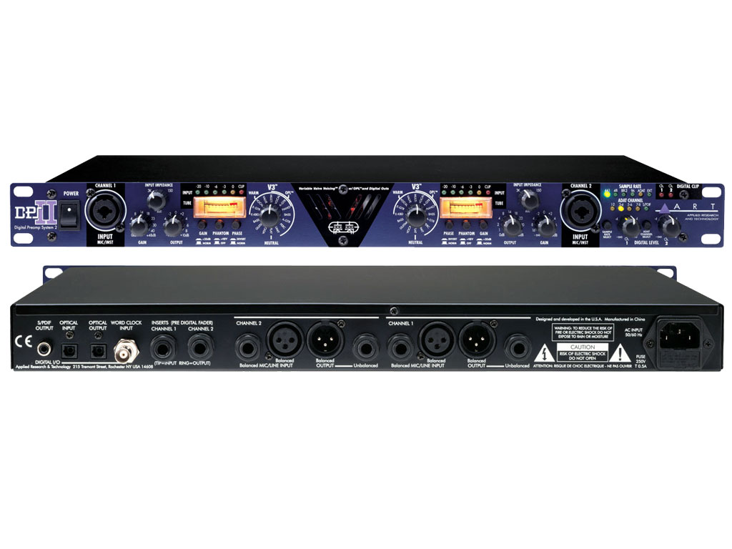 Progettati come preamplificatori ideali per ogni applicazione, i valvolari DPS II aggiungono calore e consistenza a qualsiasi sorgente audio. Questi preamplificatori ad alte prestazioni da due canali utilizzano una coppia di valvole 12AX7A selezionate a mano nel circuito d'ingresso a basso rumore. Questo, unitamente alla tecnologia proprietaria ART V3 (Variable Valve Voicing) e all'impedenza d'ingresso variabile, consente al DPS II di produrre prestazion. L'ulteriore comodità della connettività diretta tramite l'uscita digitale lo rende un expander ideale per qualsiasi interfaccia o scheda audio per computer dotata di ingresso digitale RCA S/PDIF. La tecnologia V3 fornisce dei punti di riferimento ottimizzati per avviare il processo di registrazione. I preset V3 sono stati creati e messi a punto da alcuni degli ingegneri del suono, studio e live, top del settore. La tecnologia V3 permette di scegliere tra una moltitudine di preset progettati per chitarre (elettriche e acustiche), tastiere, bassi, batterie, voci e altro ancora. La variabilità dell'impedenza d'ingresso aumenta ancora di più le potenzialità sonore del DPS II. Conferisce, infatti, consistenze sonore e timbri completamente nuovi variando l'impedenza d'ingresso del preamplificatore, che a sua volta varia il modo in cui il microfono reagisce al carico del preamplificatore. Questo crea una vasta gamma di nuove possibilità sonore con qualsiasi microfono a condensatore, a nastro o dinamico, moderno o vintage. Il DPS II è in grado di accettare picchi fino a +20dB mantenendo oltre 120dB di range dinamico, con una distorsione incredibilmente bassa. Il metering a LED dell'ingresso monitorizza il livello del segnale dell'amplificazione dell'entrata in modo che si possa ottenere il massimo guadagno senza saturare il preamplificatore all'ingresso.La tecnologia ART OPL (Output Protection Limiter) controlla con precisione e mantiene il segnale di picco dell'uscita. Il circuito OPL è fondamentale per proteggere l'anello successivo di una catena di segnale - ad esempio un sistema di registrazione su hard disk o una scheda audio - perché, a differenza del clipping analogico che suona musicale e talvolta gradito, il clipping digitale è sgradevole e spesso fatale per i tweeter dei monitor. Le uscite digitali includono S/PDIF, TOSLINK o ADAT (selezionabili dal pannello frontale). La conversione A/D è regolabile sul pannello frontale da 44.1kHz a 96kHz o sincronizzabile ad ADAT o wordclock esterno (da 32kHz a 100kHz). Più unità DPS II possono essere aggiunte ad uno stream ADAT. Un versatile insert loop su ciascun canale fornisce l'accesso ad ulteriori processamenti di segnale o l'accesso diretto al nostro convertitore A/D di alta qualità. I controlli di guadagno separati sulle uscite analogiche e digitali permettono di ottimizzare l'unità per applicazioni simultanee.