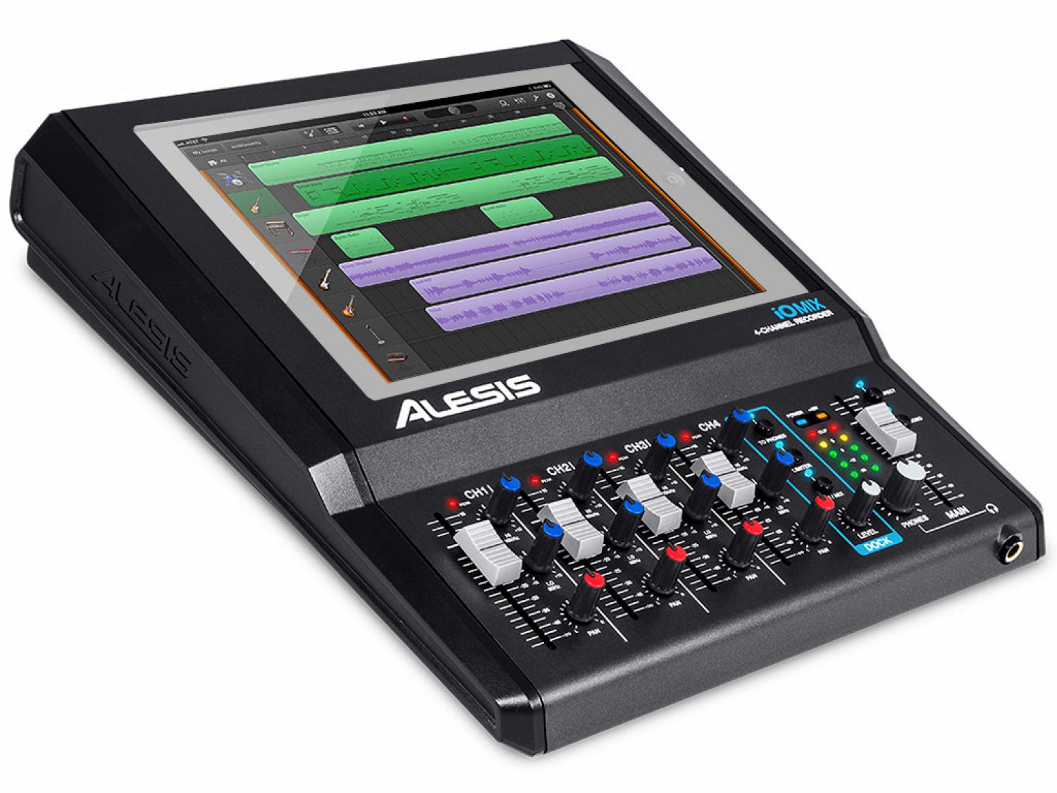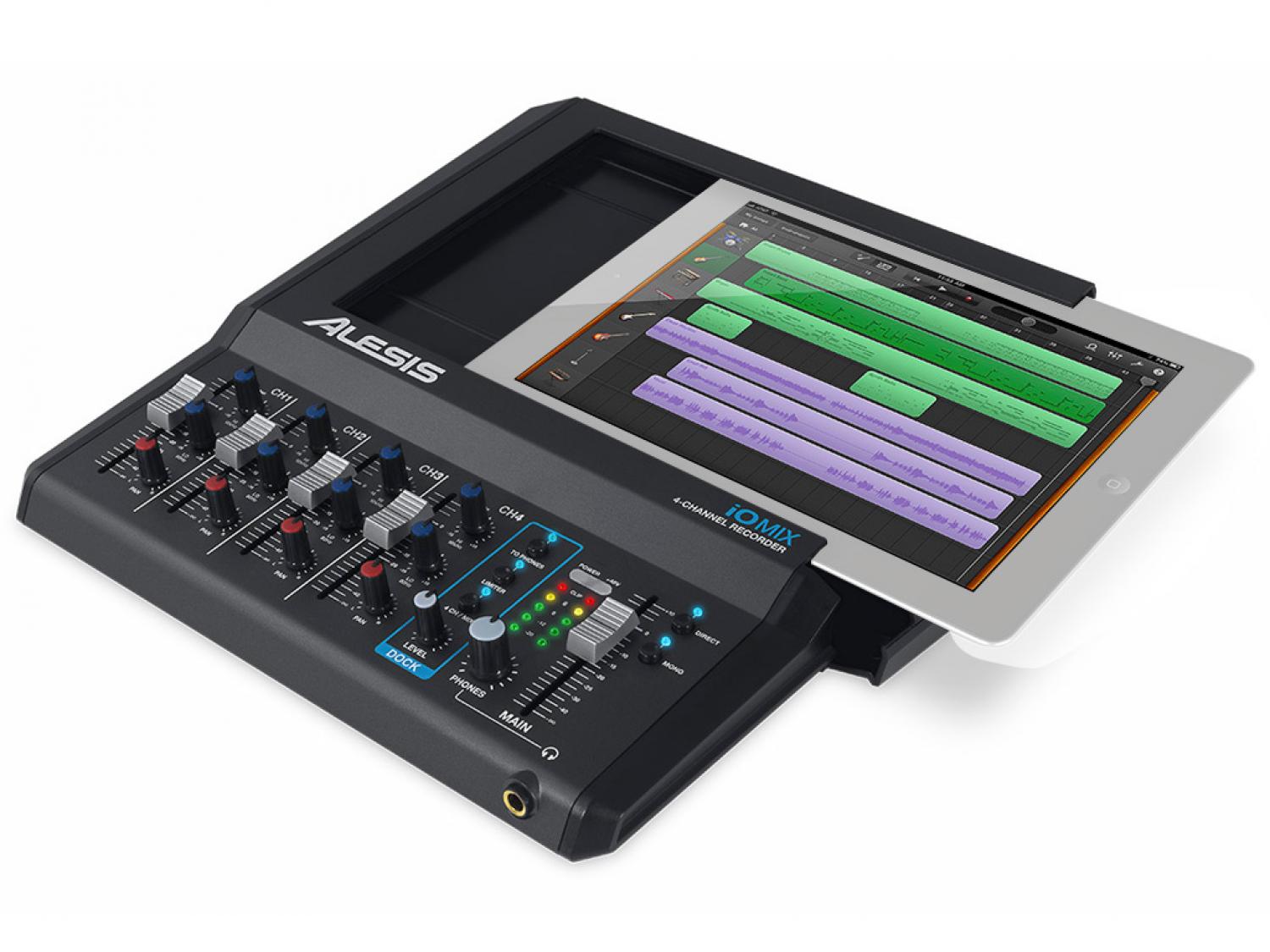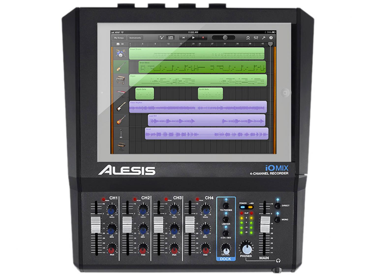 L'Alesis iO Mix è il primo strumento al mondo che trasforma il tuo iPad in uno studio di registrazione portatile multi traccia, per consentirti di registrare contemporaneamente più microfoni, o strumenti su tracce separate nelle applicazioni compatibili Core Audio, come Garage Band. Tra le connessioni disponibili nell'iO Mix troviamo 4 ingressi combo (XLR e Jack da 1/4"), un'uscita stereo bilanciata su connettori Jack TRS da 1/4" e un'uscita video su connettori RCA (composito) e S-Video. Alesis iO Mix integra il tuo iPad alla perfezione grazie ad una cornice che ne permette un comodo inserimento e che lo protegge mediante da eventuali disconnessioni. Nel pannello posteriore avremo a disposizione su ciascun canale guadagno, filtro passa alte, alimentazione phantom (attivabile su gruppi di due canali: 1/2 e 3/4). Sul primo canale è inoltre disponibile uno switch guitar/mic-line, per consentire il collegamento di chitarre e bassi elettrici. Sulla plancia del mixer sono invece disponibili controlli di Volume, Pan ed EQ 2-bande per bassi e alti. iO Mix di Alesis mette inoltre a disposizione un limiter attivabile a discrezione dell'utente, per evitare clip durante la registrazione, e la funzione Direct Monitoring per poter ascoltare in diretta, senza latenza, le sorgenti collegate mentre stiamo registrando. Con Alesis Module Mount (non fornito in dotazione) sarà possibile posizionare il tuo iO Mix su qualsiasi asta microfonica.